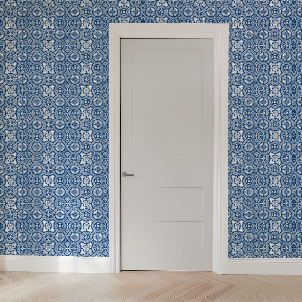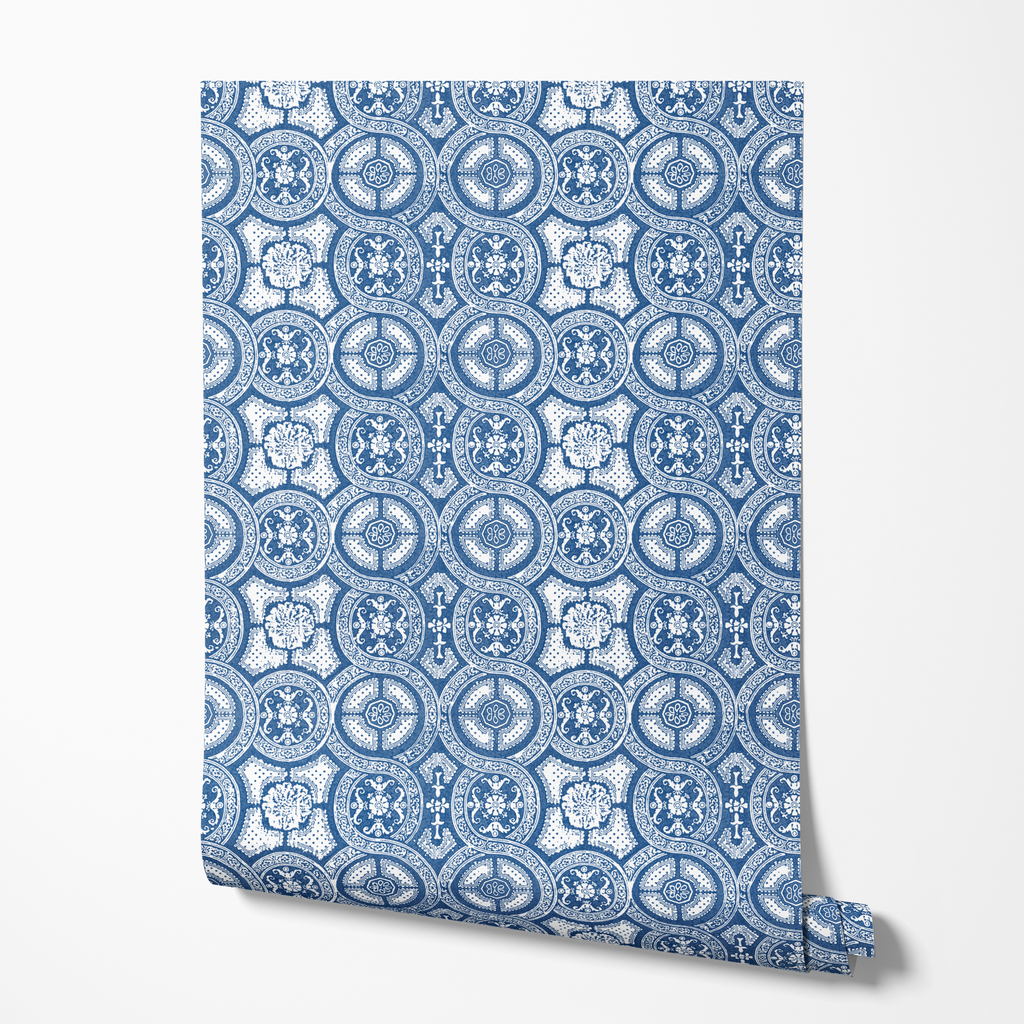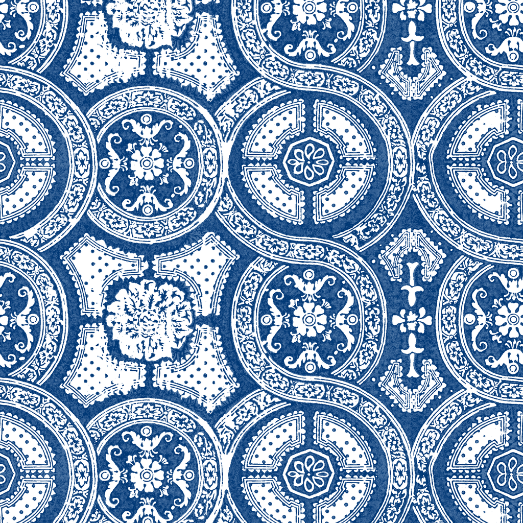 Elegant blue and white porcelain-inspired pattern featuring intricate medallions and floral motifs in a traditional chinoiserie style, perfect for classic home decor.
