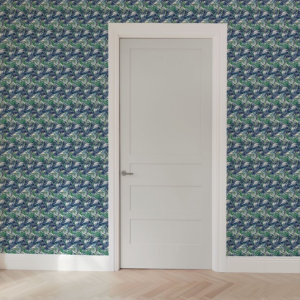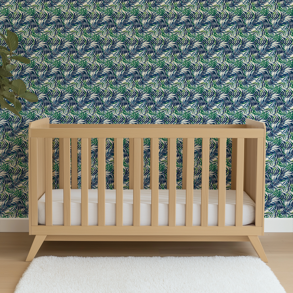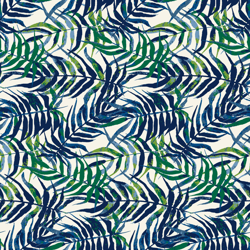 Vibrant tropical palm leaves in rich navy blue and emerald green create a lush botanical pattern on a crisp white background - perfect for a modern jungle-inspired look.