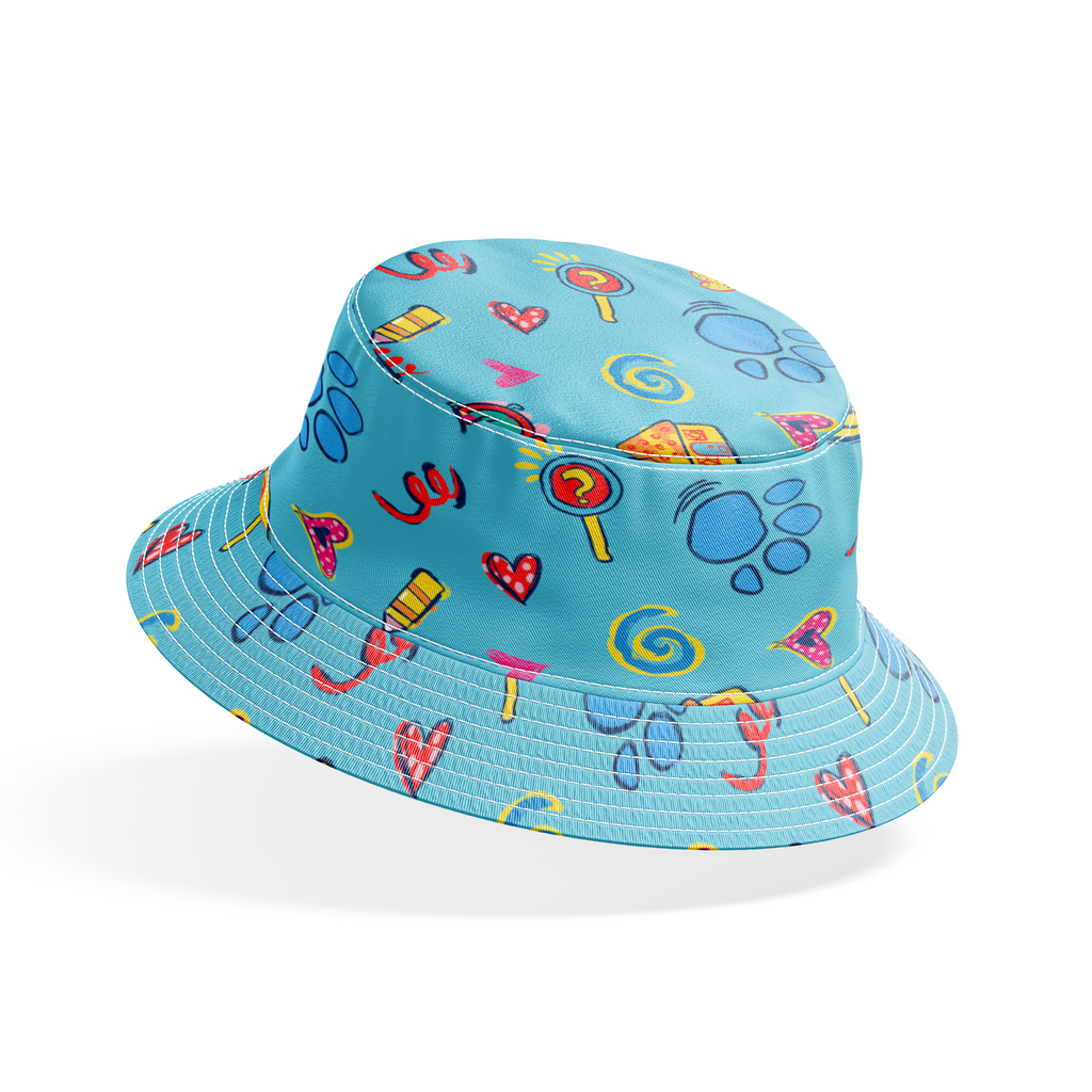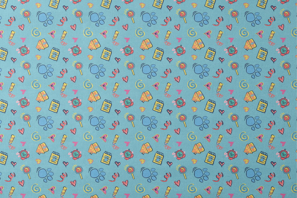 Officially licensed Blue’s Clues design featuring playful hand-drawn icons like paw prints, hearts, a magnifying glass, a crayon, and the Thinking Chair scattered across a light blue background. Perfect for kids’ apparel, accessories, and preschool-themed decor.