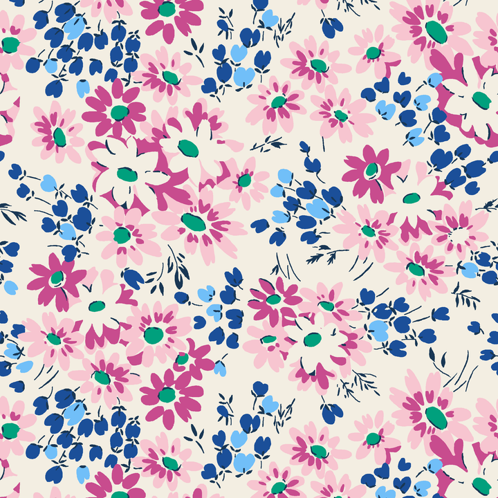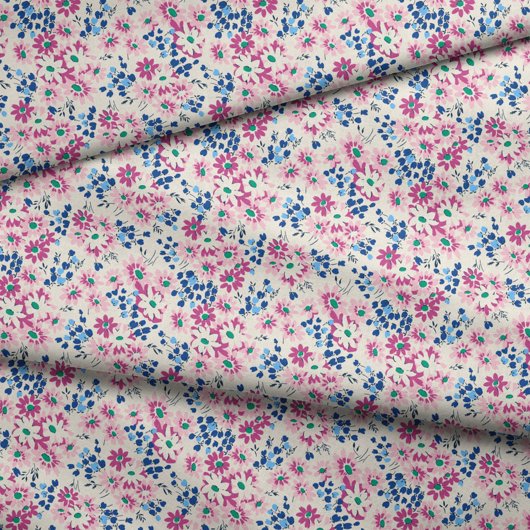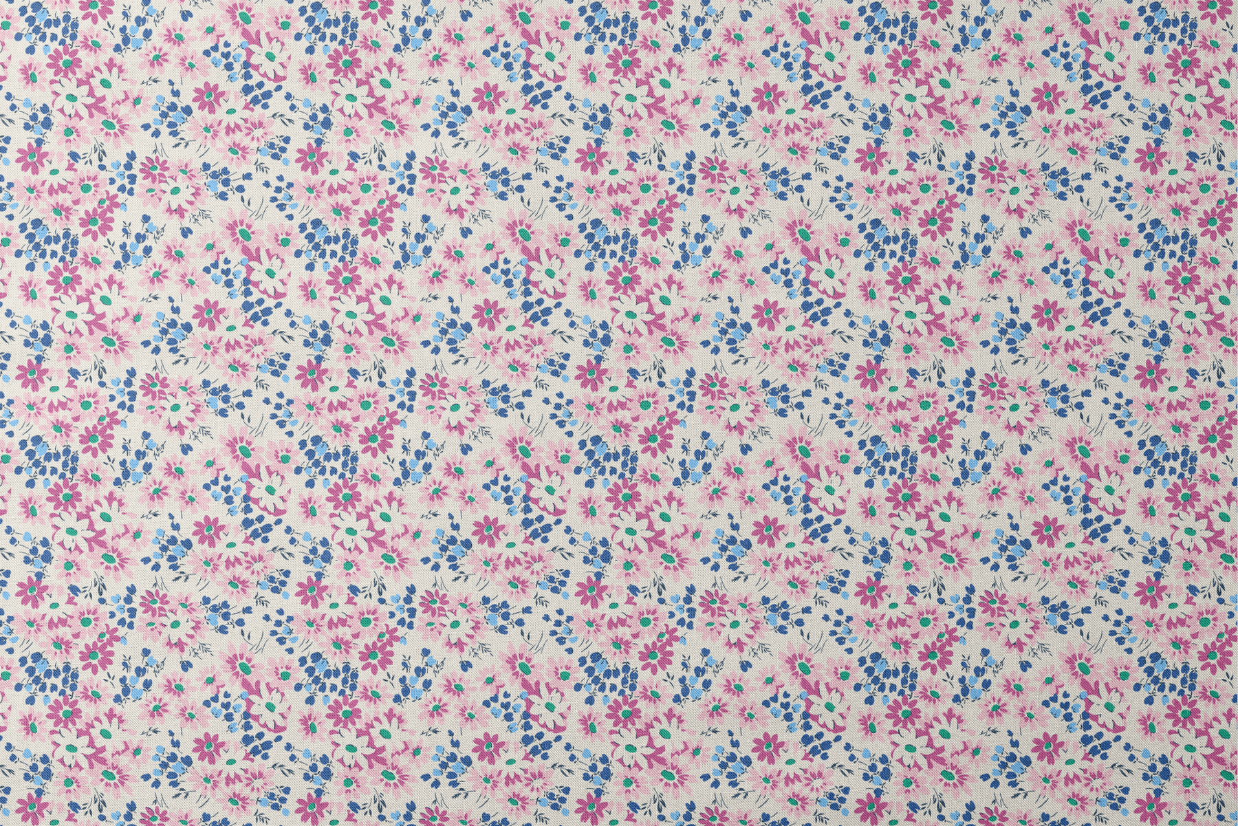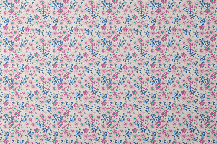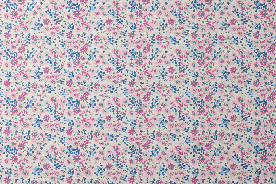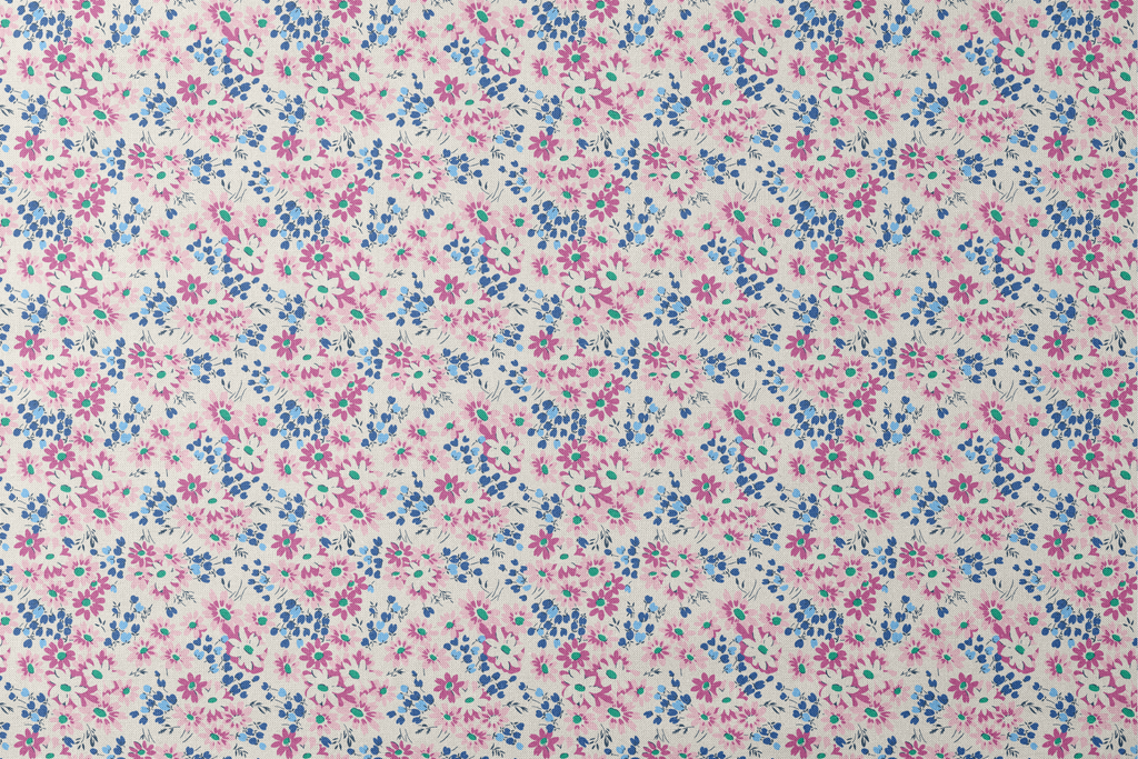 Delicate pink and magenta florals with blue berries create a charming vintage pattern, perfect for spring apparel or romantic home decor. The medium-scale design features painterly blooms with green accents on a cream background.