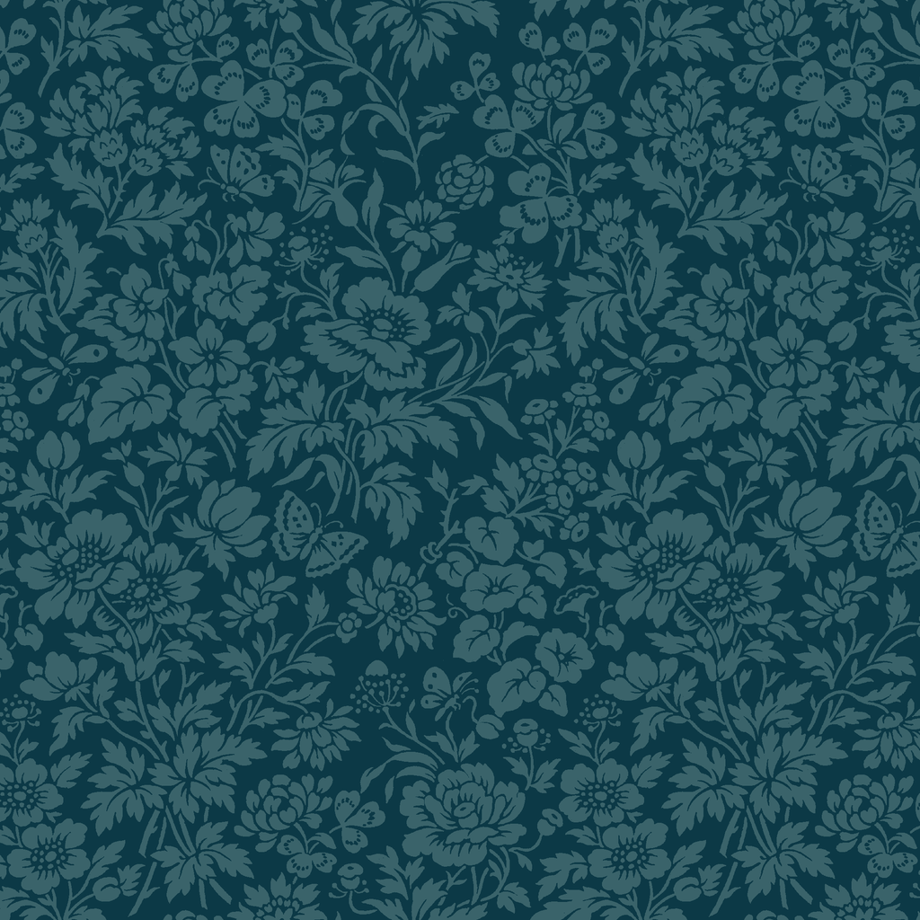 Vintage-inspired floral damask wallpaper in moody dark teal creates a timeless, sophisticated pattern perfect for classic interiors and nature-inspired spaces.
