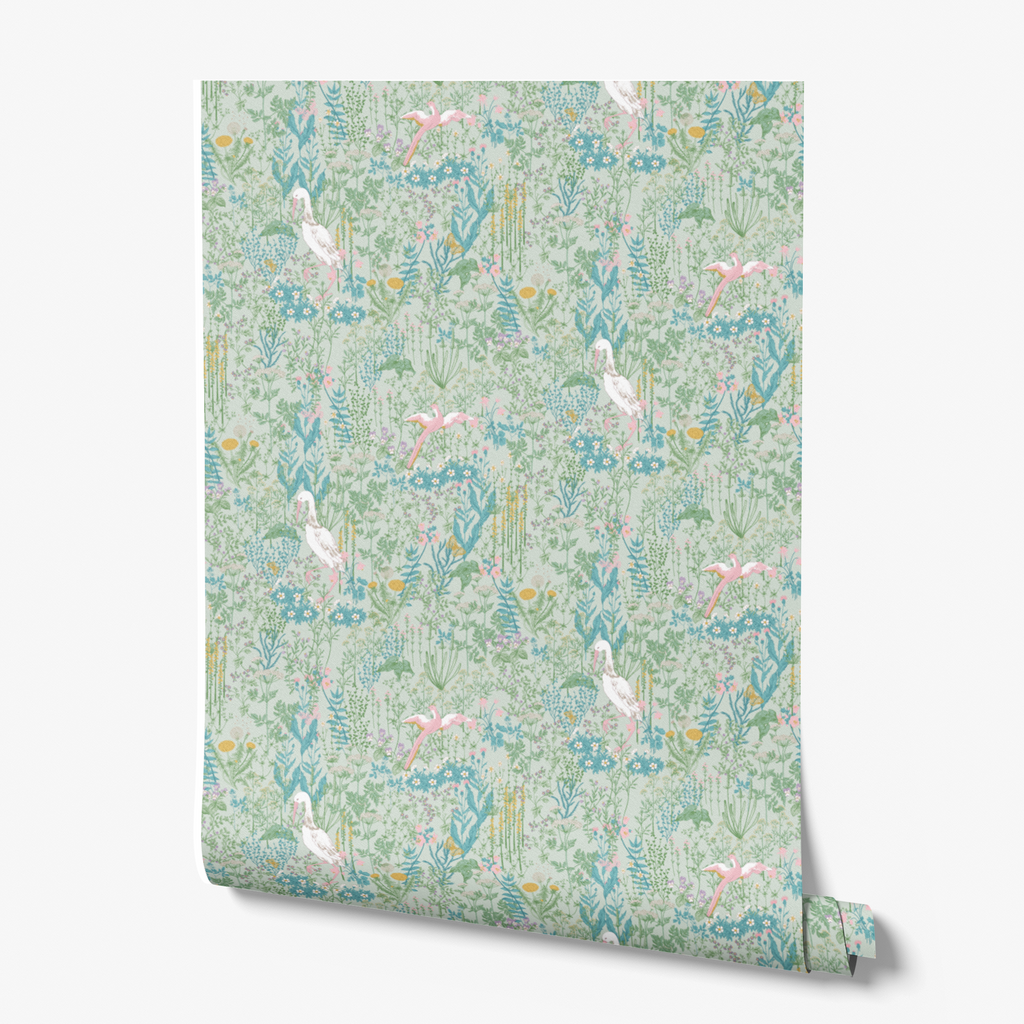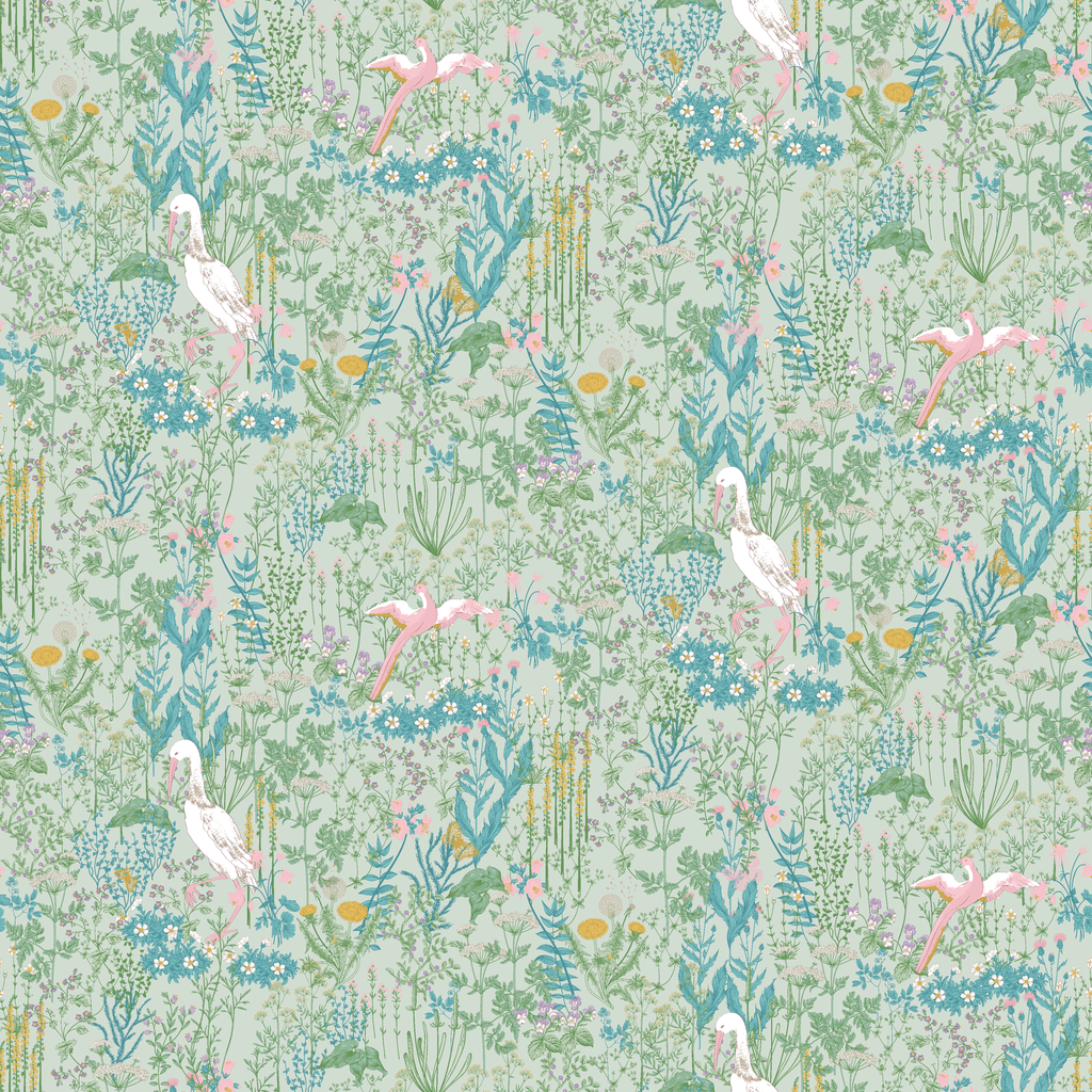 This delicate botanical wallpaper features a soft minty green background adorned with wildflowers, ferns, and birds in pastel blue and pink hues, creating a tranquil garden-inspired pattern perfect for elegant interiors.
