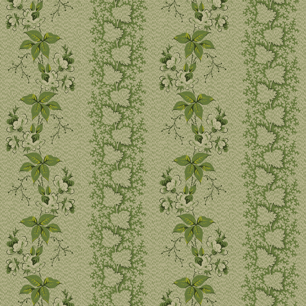 Vintage botanical floral pattern featuring delicate green leaves and flowers on a sage green background with a traditional toile-inspired aesthetic.