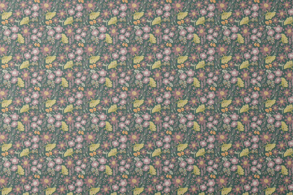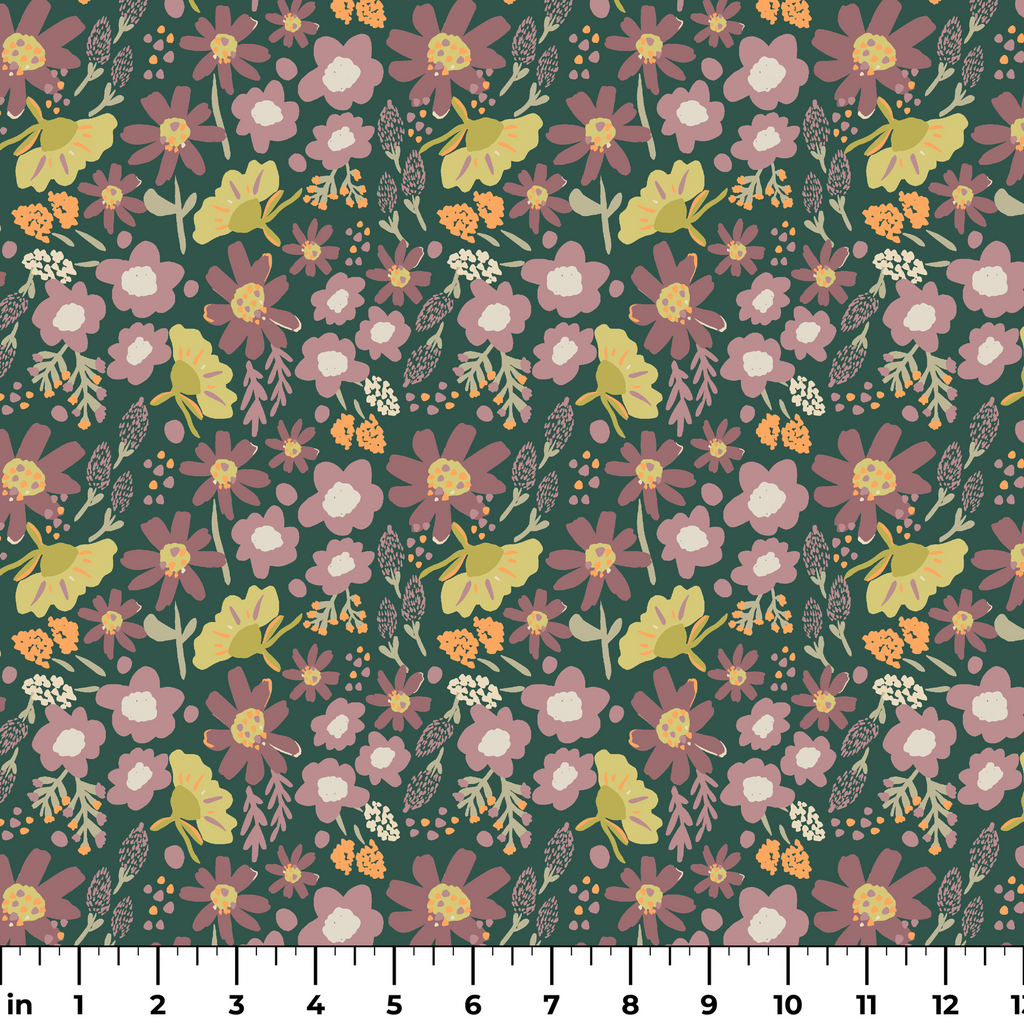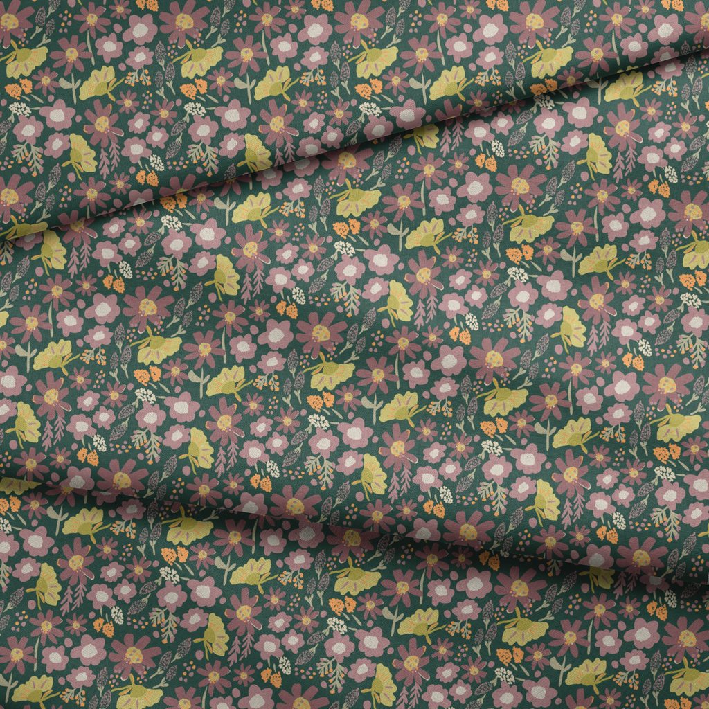 Beautiful vintage-inspired floral pattern with pink daisies and yellow blooms on a deep green background, creating a bohemian garden aesthetic perfect for home decor or apparel.