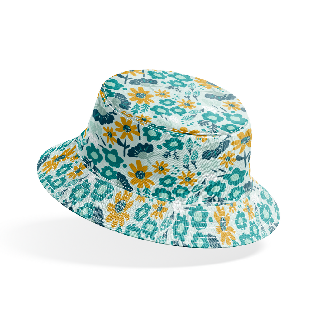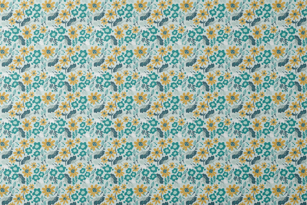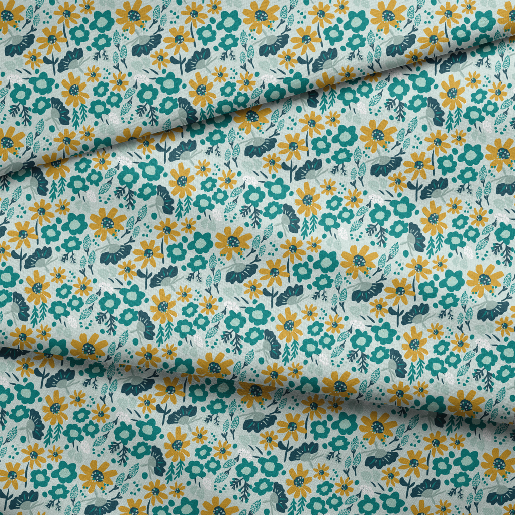 Cheerful teal and mustard floral pattern featuring abstract daisies and blooms in a contemporary design. Perfect for home decor or apparel with its fresh, modern botanical motif.