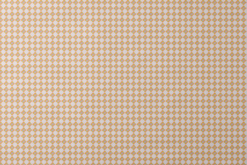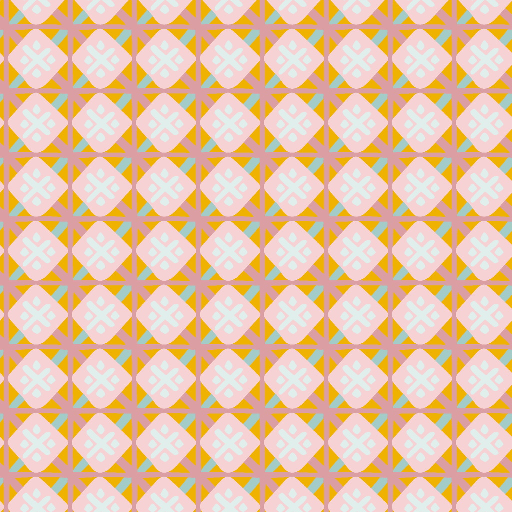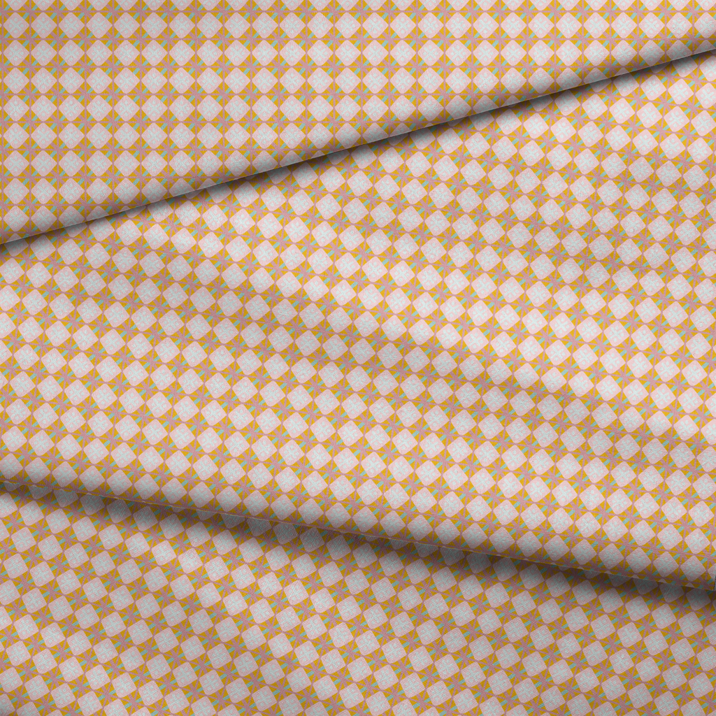 Retro geometric pattern featuring white squares with delicate motifs on a warm mustard and orange background. Perfect for midcentury-inspired home decor or vintage apparel designs.