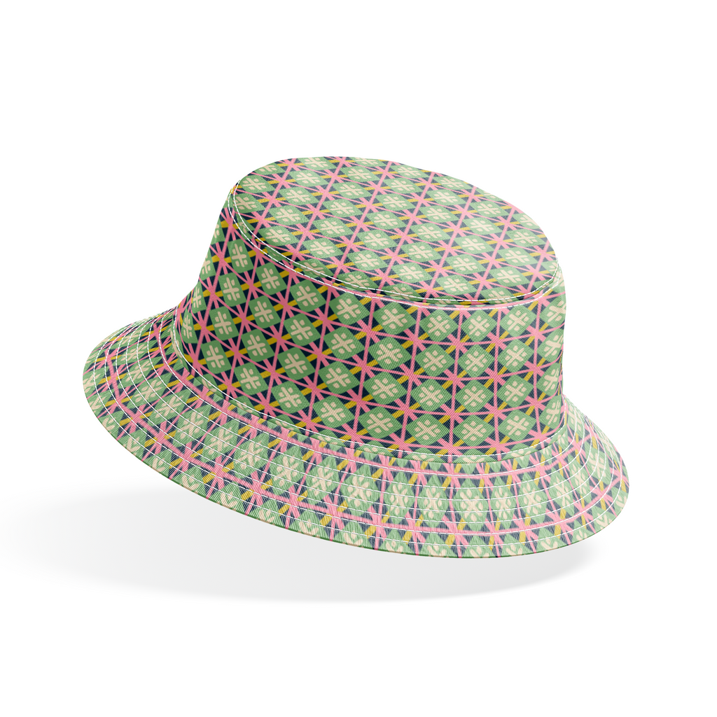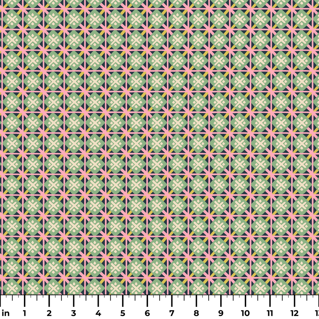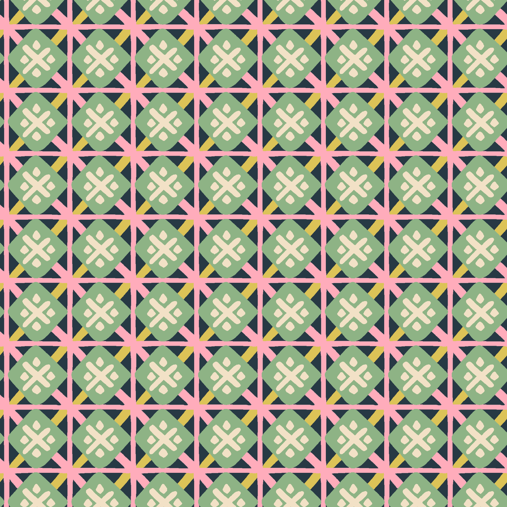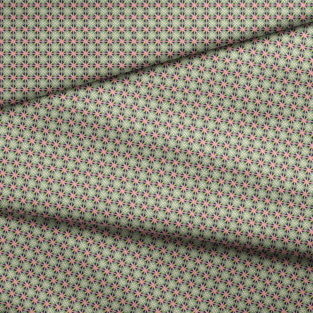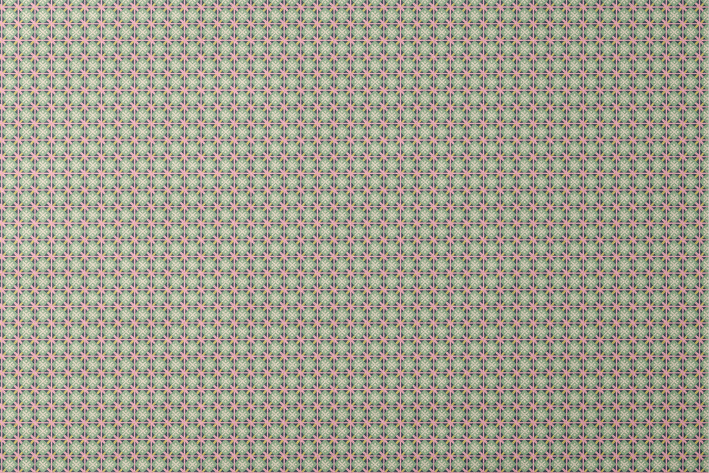 Vibrant geometric pattern featuring intersecting star motifs in mint green, coral pink, and yellow, creating a retro-inspired grid design with a contemporary twist.