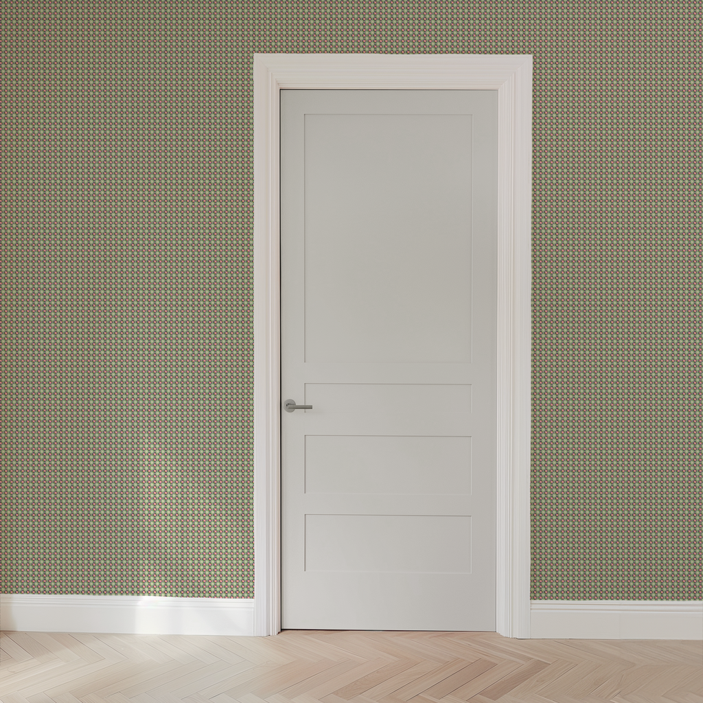 Vibrant geometric pattern featuring intersecting star motifs in mint green, coral pink, and yellow, creating a retro-inspired grid design with a contemporary twist.