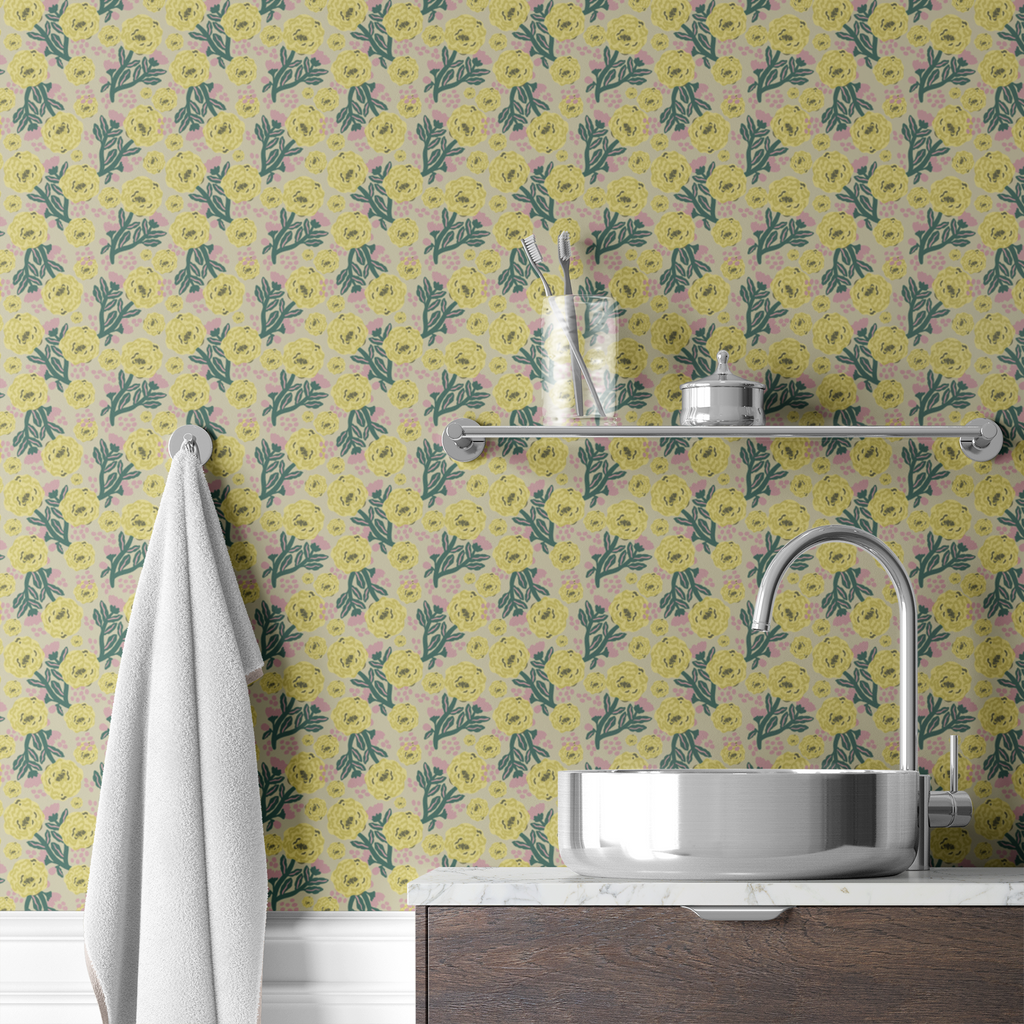 Vintage-inspired floral pattern featuring yellow peonies with deep green stems on a muted beige background, creating a whimsical garden aesthetic perfect for home decor or apparel.