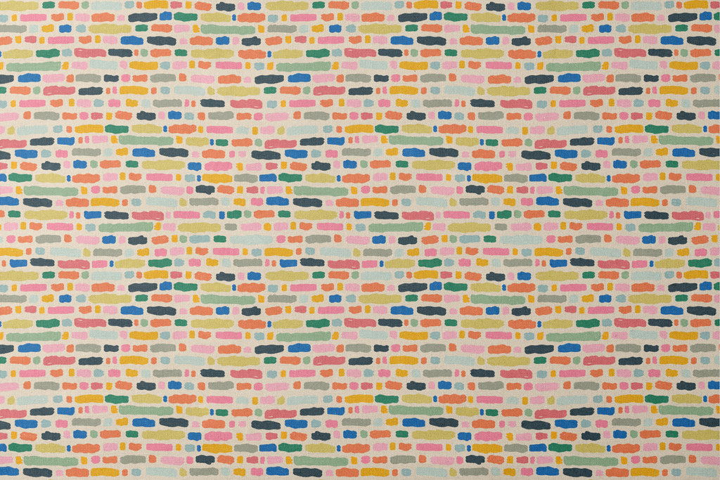 Colorful brushstrokes in a modern geometric pattern create a playful brick-like design with vibrant hues of pink, orange, yellow, blue, and green for a contemporary, artistic look.