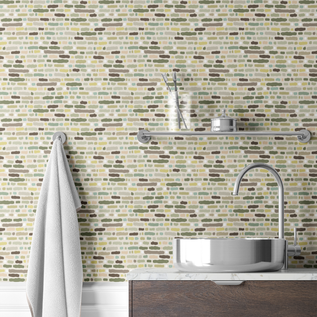 Modern geometric brick pattern in soft neutrals, greens, and yellows with irregular shapes for a contemporary, abstract style that adds subtle texture to any space.