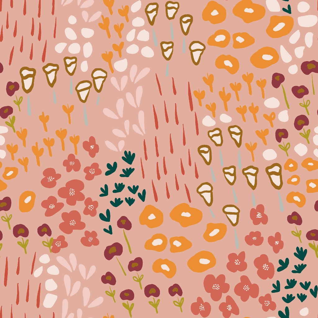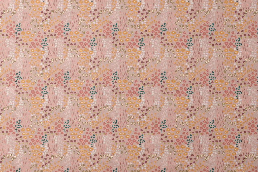 Abstract floral pattern in muted peach tones with organic shapes and botanical elements, featuring splashes of ochre and teal for a contemporary bohemian aesthetic.