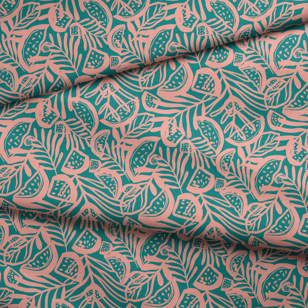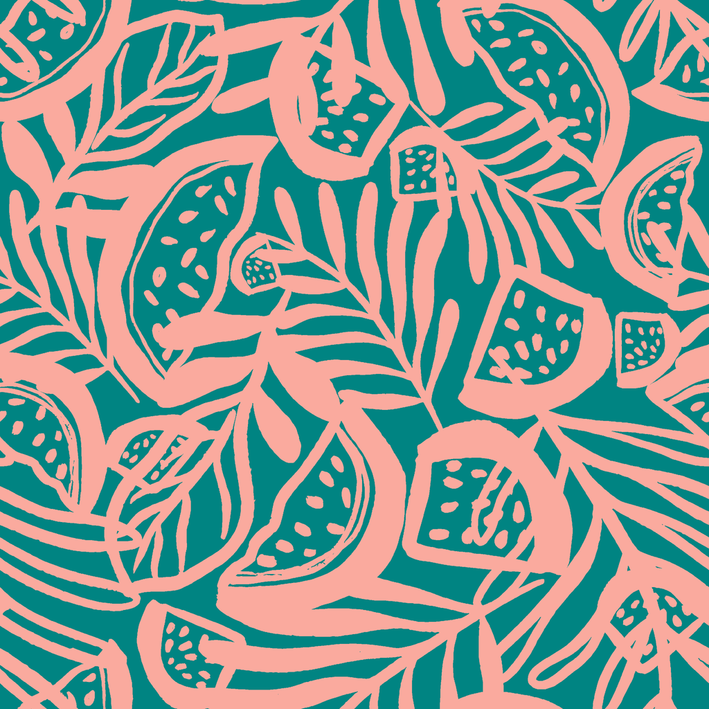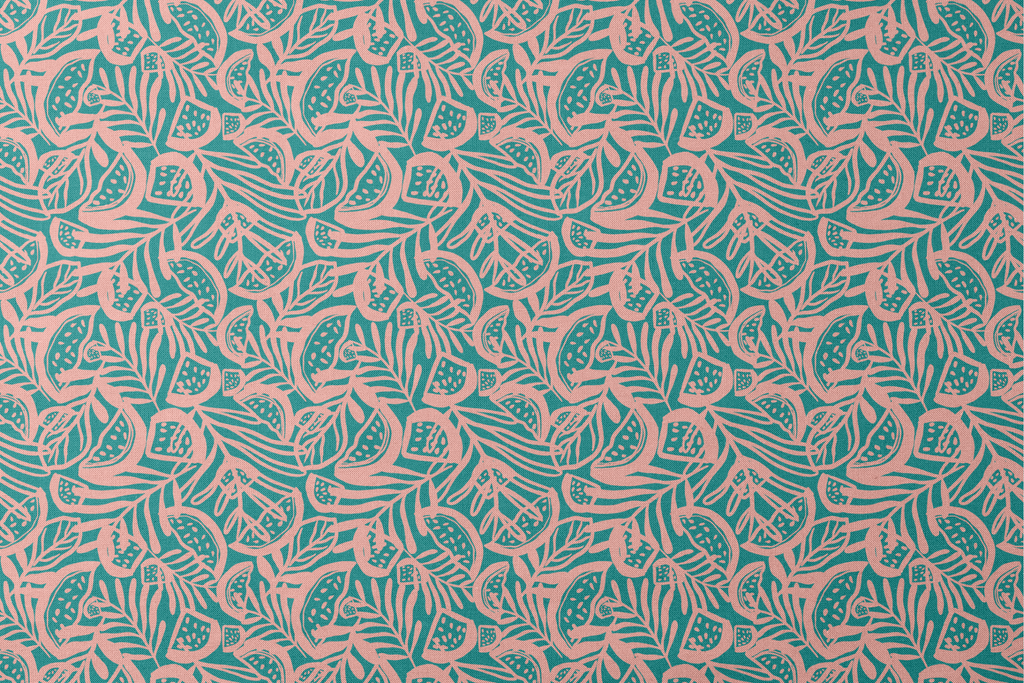 Vibrant teal and coral abstract tropical pattern featuring stylized leaves and organic shapes in a contemporary bohemian design.