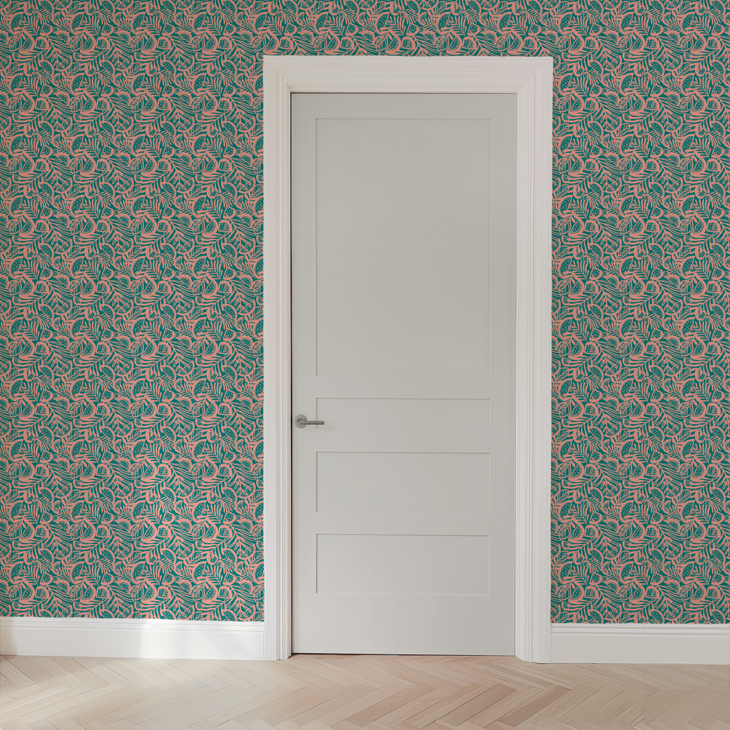 Vibrant teal and coral abstract tropical pattern featuring stylized leaves and organic shapes in a contemporary bohemian design.