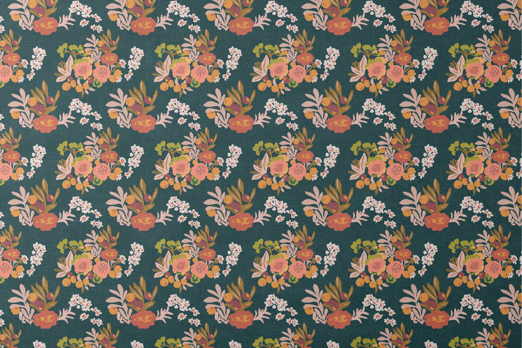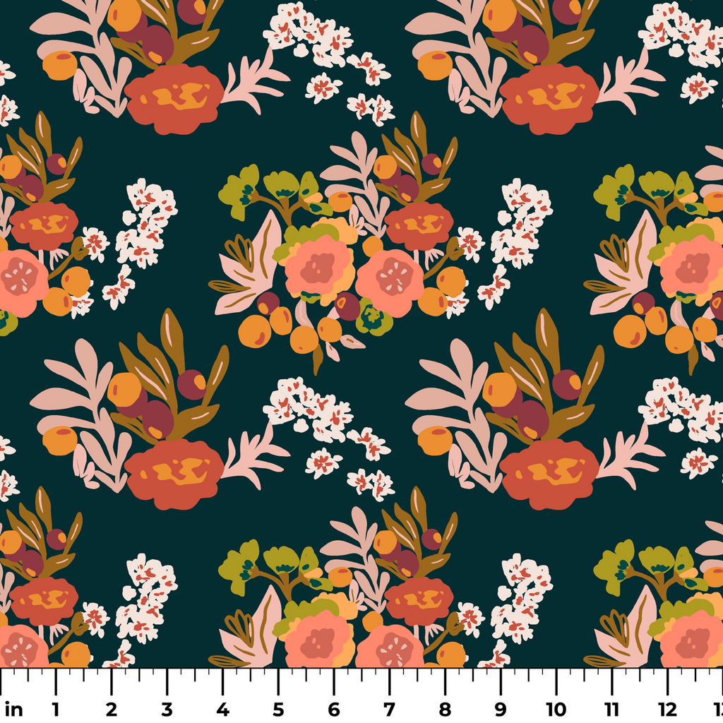 Vintage-inspired floral pattern featuring rich autumn blooms in terracotta, sage, and blush against a deep teal background. Perfect for bohemian home decor or modern apparel.