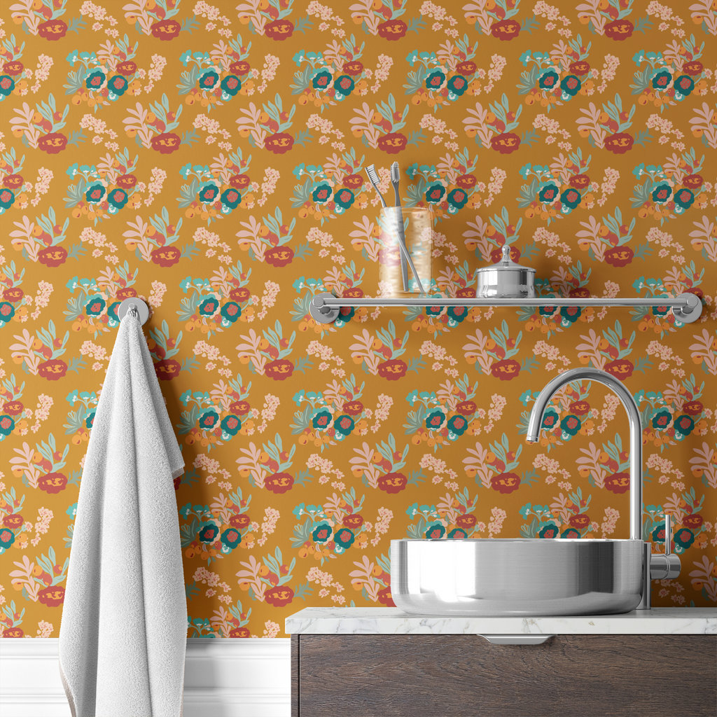 Vibrant folk-inspired floral pattern on a rich mustard background with teal, burgundy, and peachy blossoms. Perfect for bohemian home decor or apparel with its whimsical, retro aesthetic.