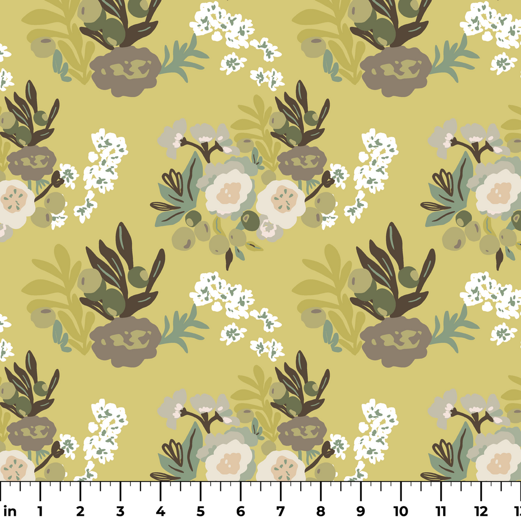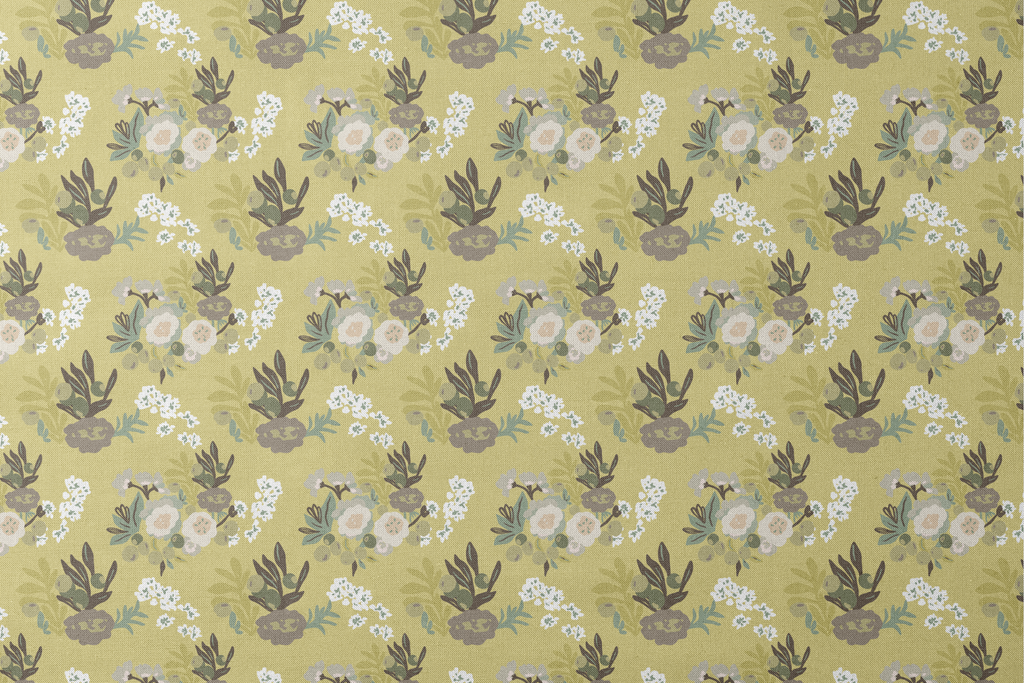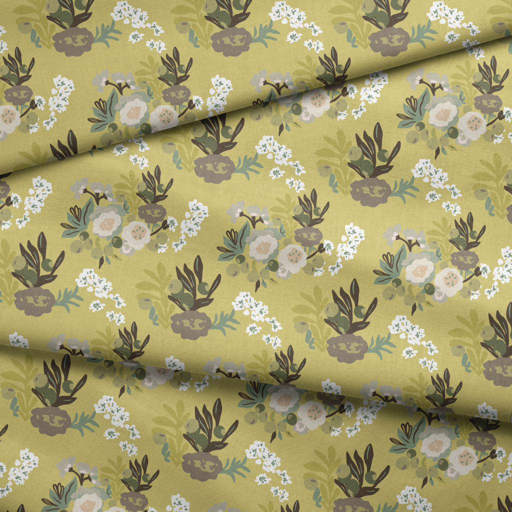 Sophisticated floral print in lime green with olive green foliage and delicate white blossoms. Traditional botanical motif with a mid-century modern aesthetic.