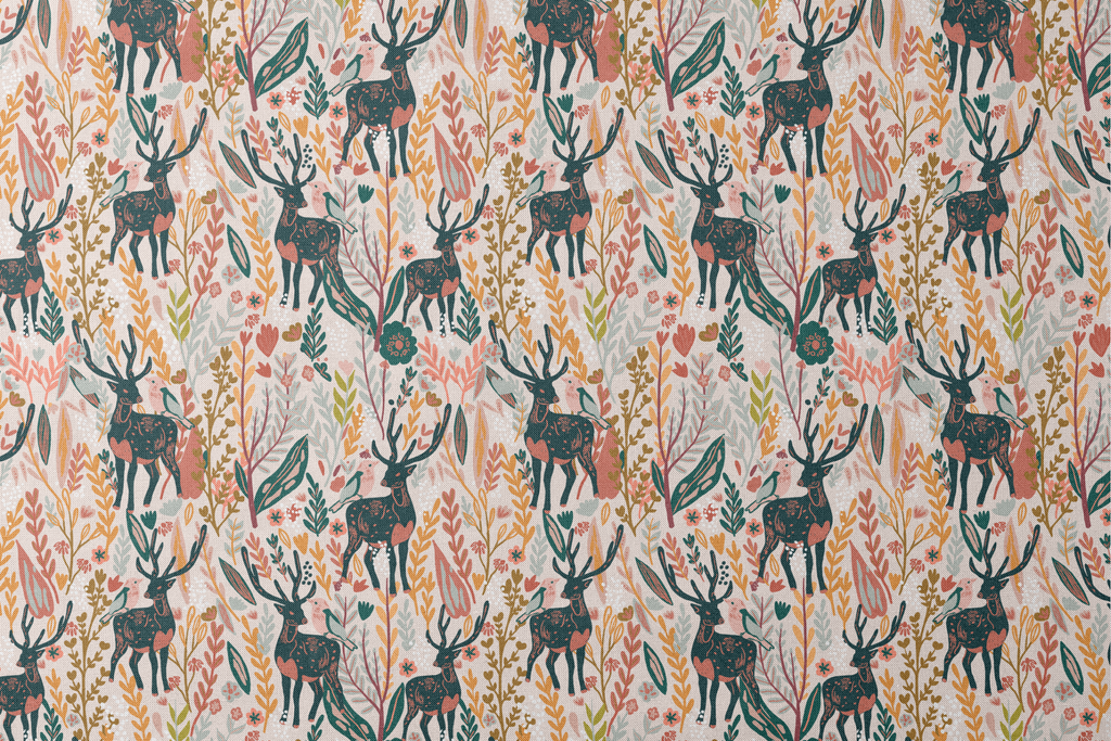 Enchanting woodland pattern featuring silhouetted deer among colorful autumn botanicals. Rich coral, mustard, and sage florals create a whimsical nature-inspired design perfect for home decor or apparel.