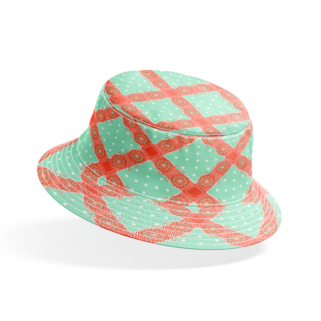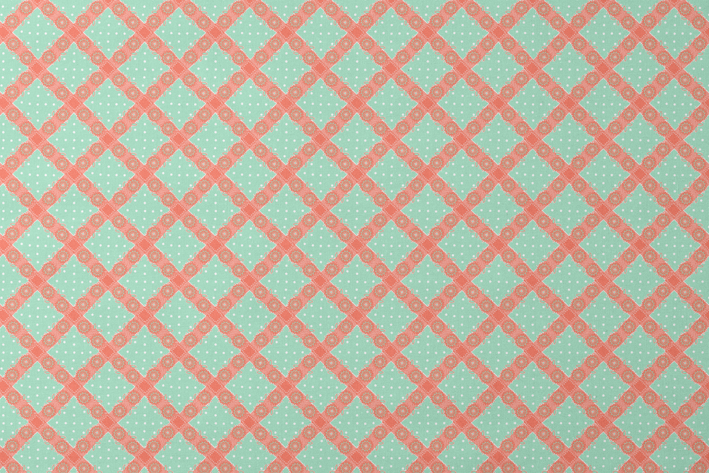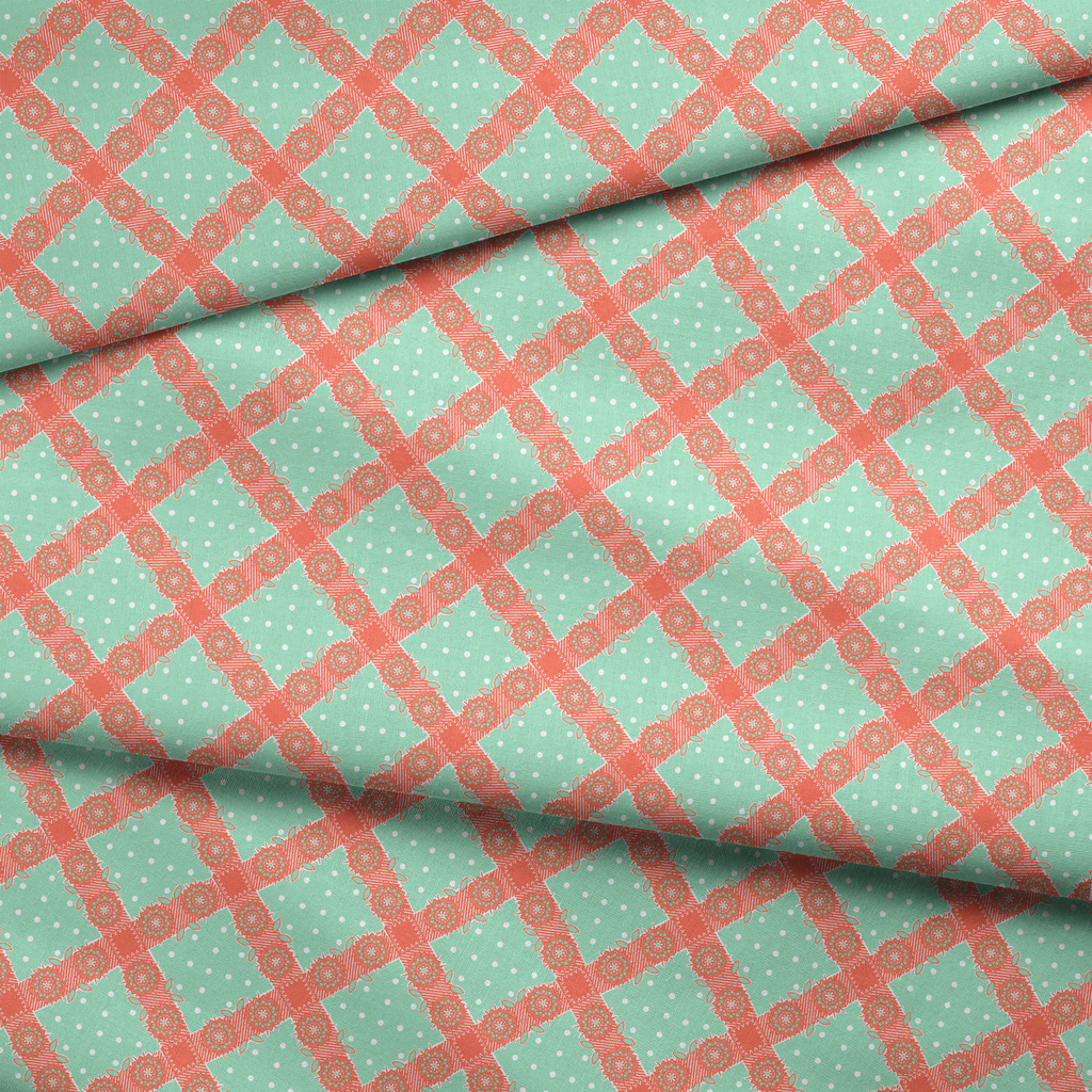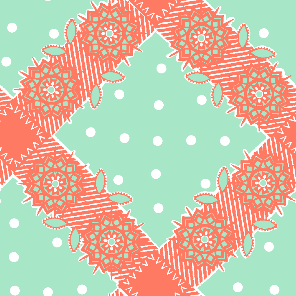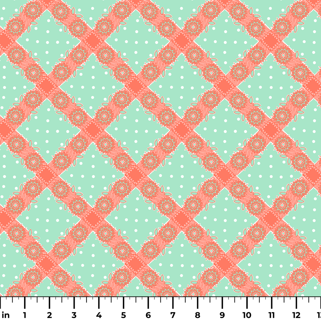 Festive coral floral diamond pattern on a mint green polka dot background, perfect for quilting projects and home decor.