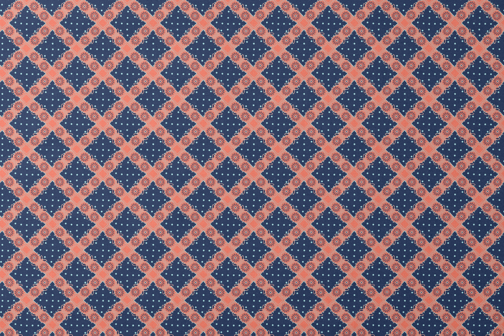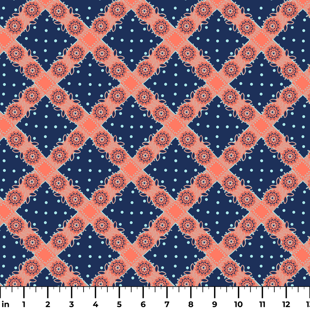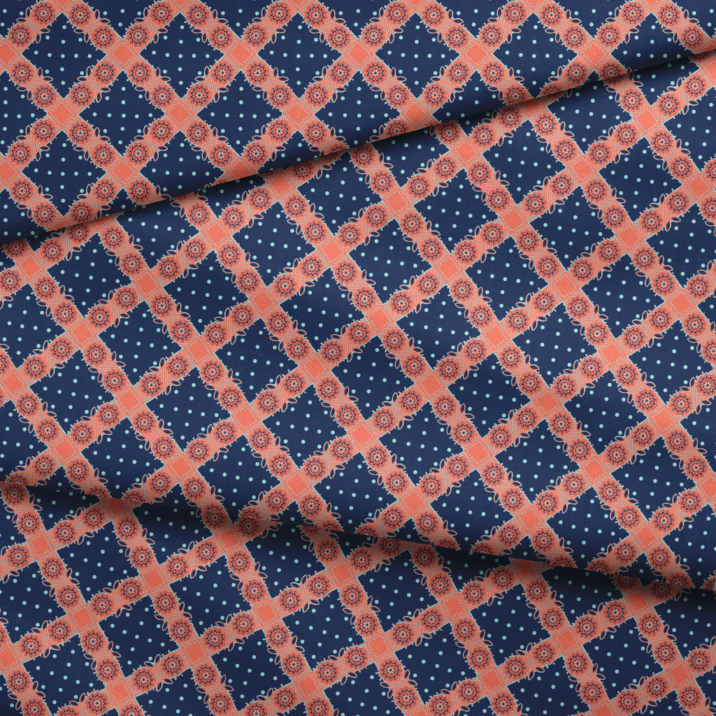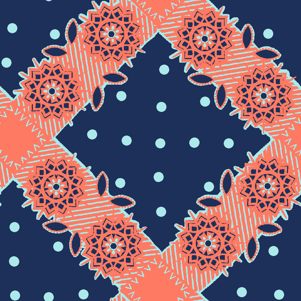 Vibrant coral mandala florals with geometric details on a navy blue dotted background create a bold bohemian folk art pattern perfect for contemporary home decor.