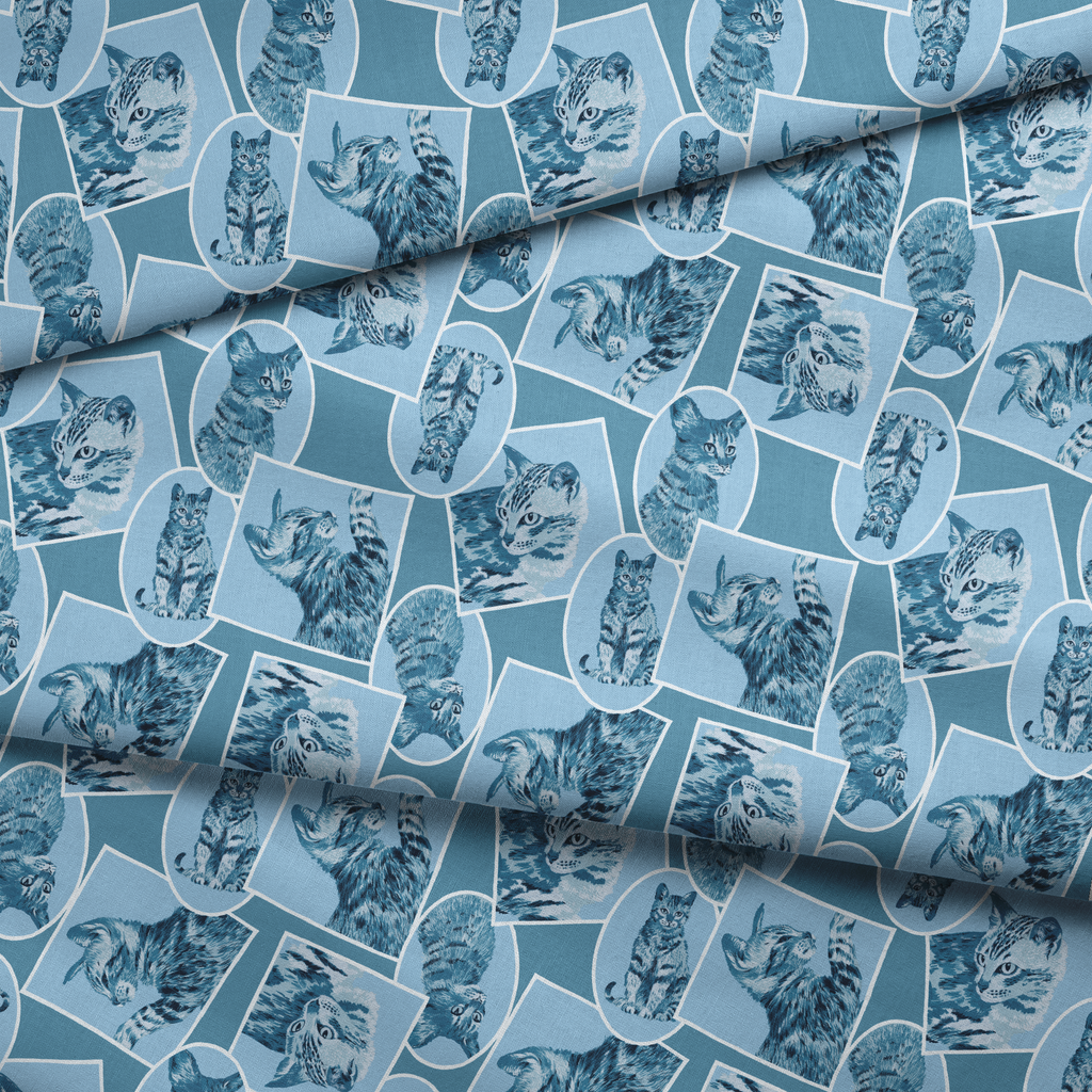 Blue monochromatic cat pattern featuring vintage-style photographs of adorable kittens and cats scattered in an all-over repeating design perfect for cat lovers.