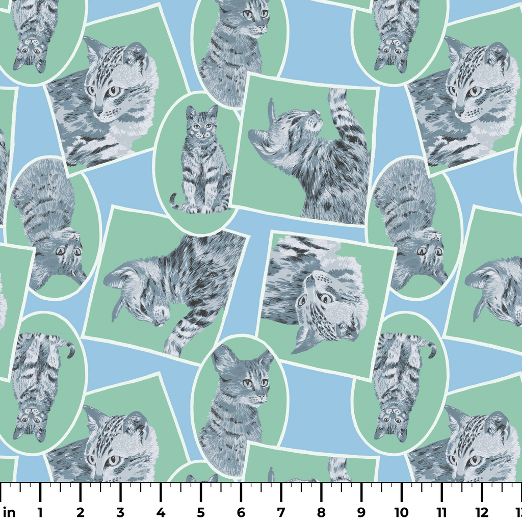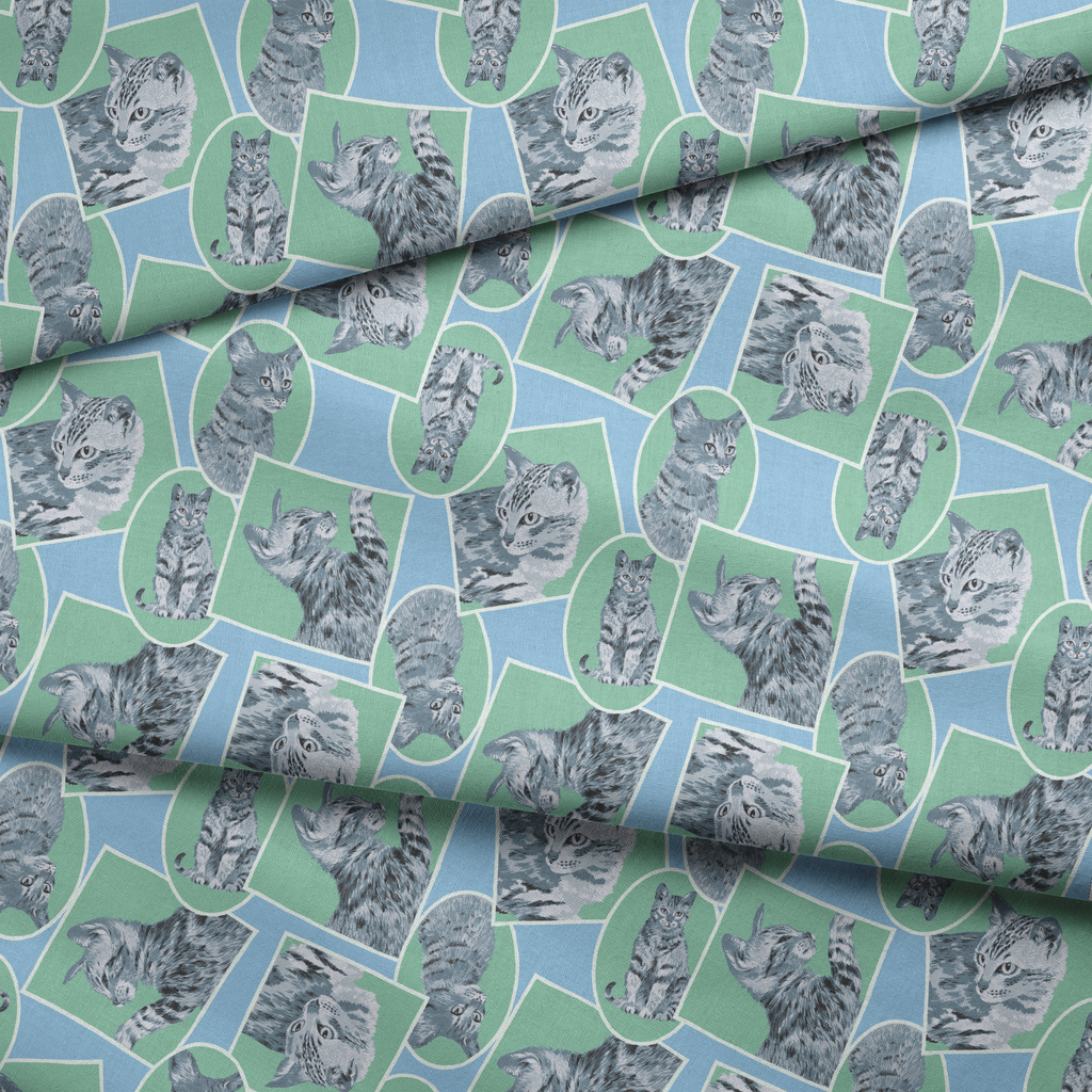 Adorable tabby cats pattern in soft blue and green tones with realistic illustrated kittens in various playful poses on a whimsical scattered layout.