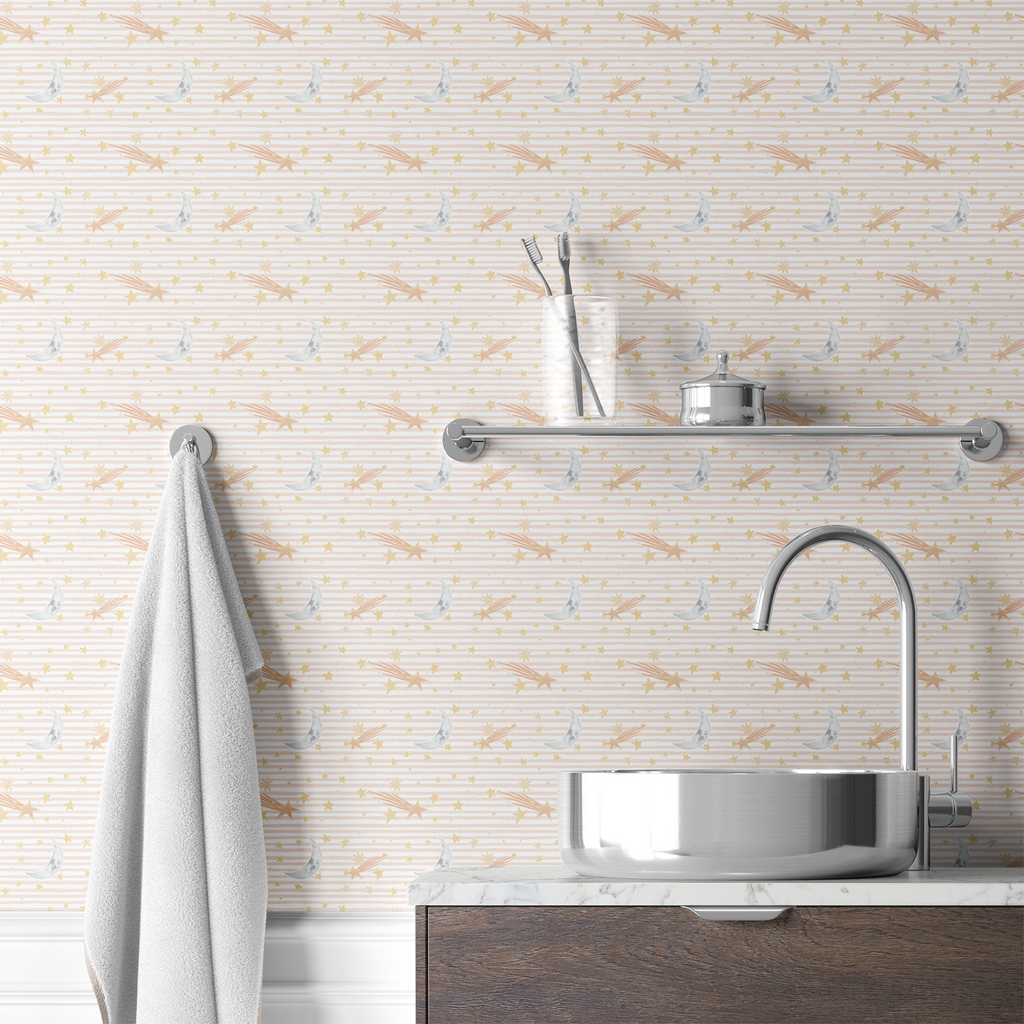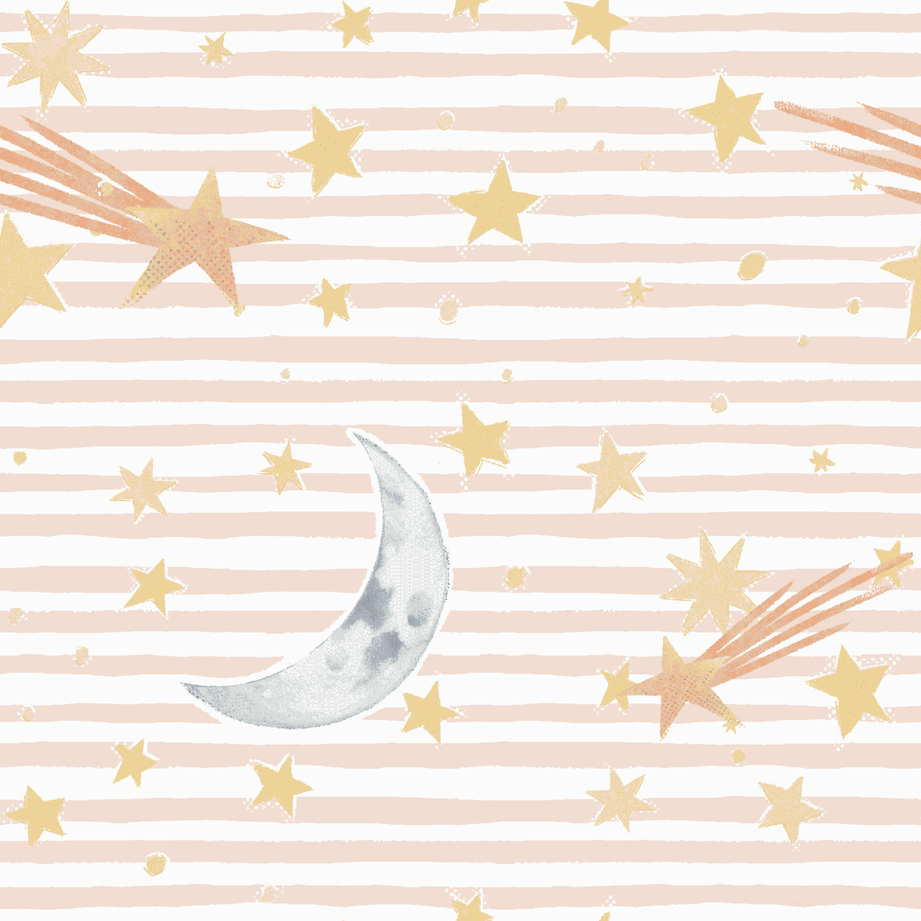 Whimsical celestial pattern featuring golden stars, shooting comets, and a soft watercolor crescent moon on delicate pink and white stripes, perfect for nursery decor or children's fashion.