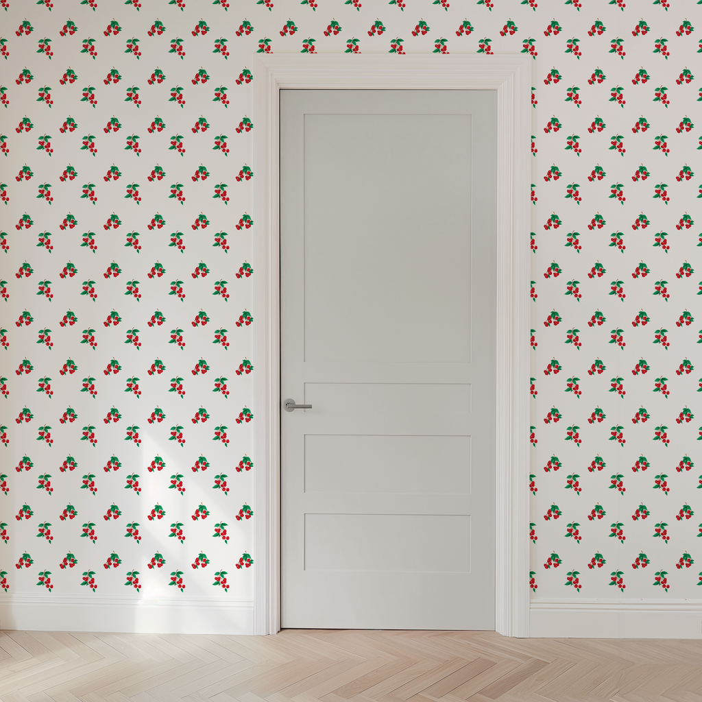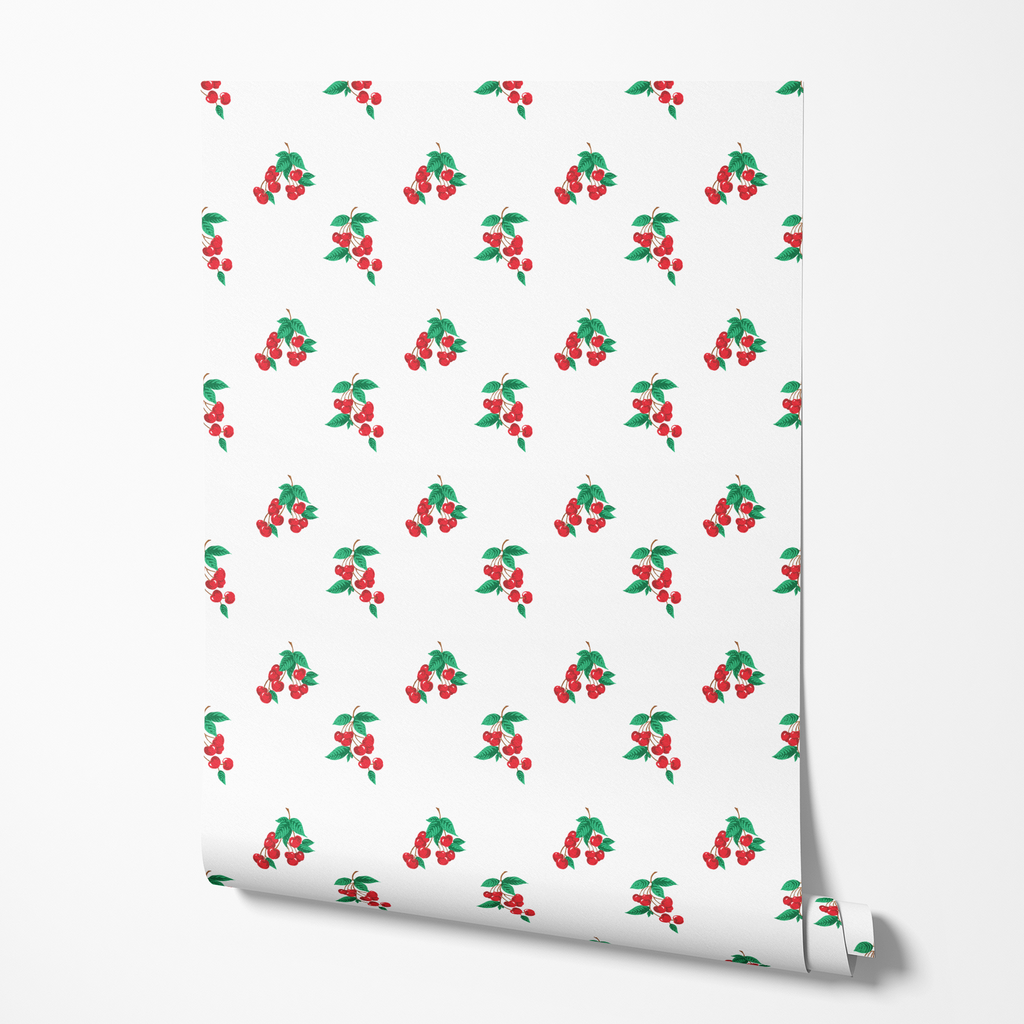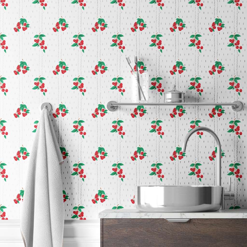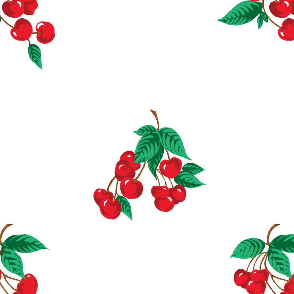 Vintage cherry pattern featuring bright red cherries with vibrant green leaves on a white background. Perfect for kitchen decor, retro fashion, or nostalgic summer style.