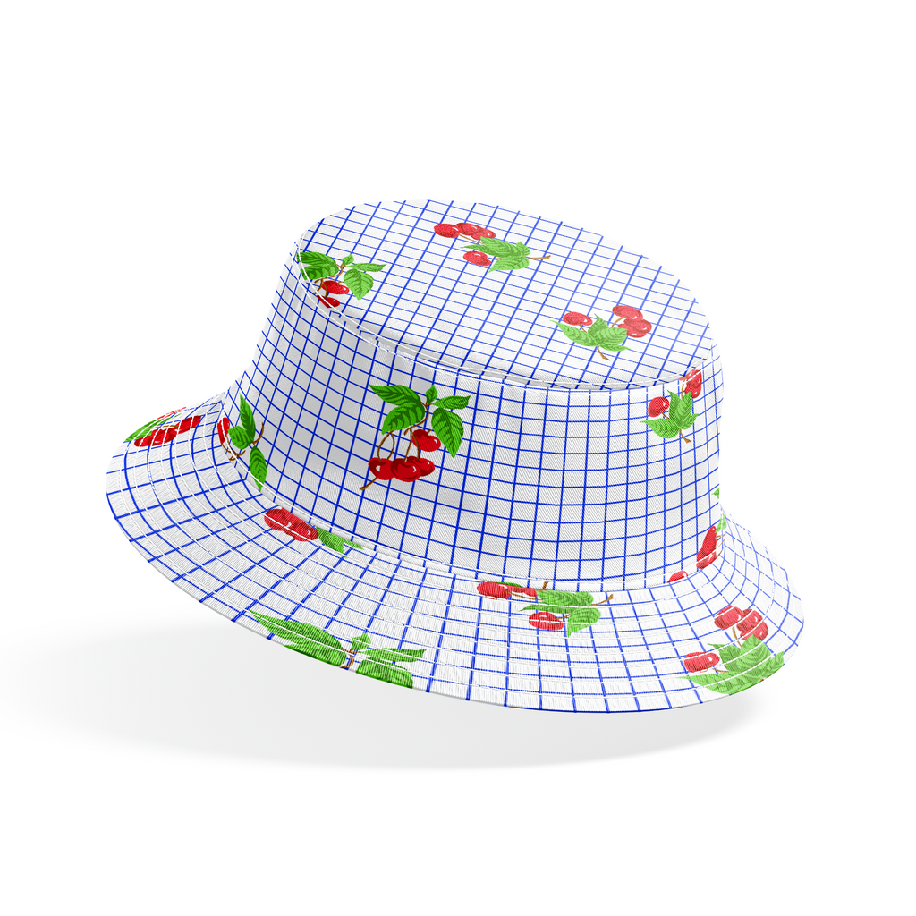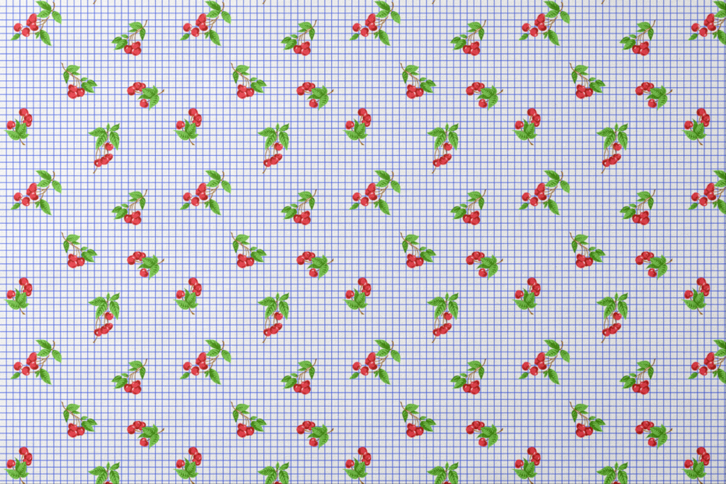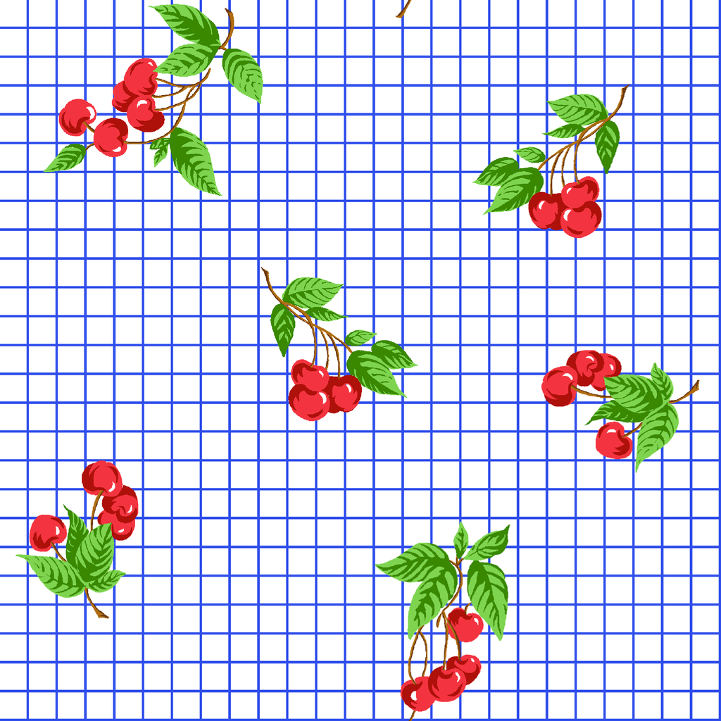 Vibrant cherry pattern on grid background perfect for kitchen decor or summer fashion. This playful fruit design adds a retro touch to any space.