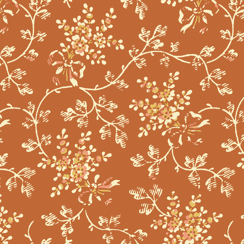 Elegant floral chinoiserie vines with cream blooms gracefully against a warm rust background, creating a timeless botanical aesthetic.