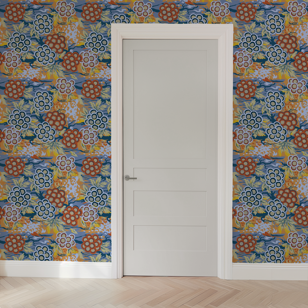 Vibrant retro floral pattern featuring stylized berries in blue, orange, and yellow with flowing organic shapes and bold contemporary colors.