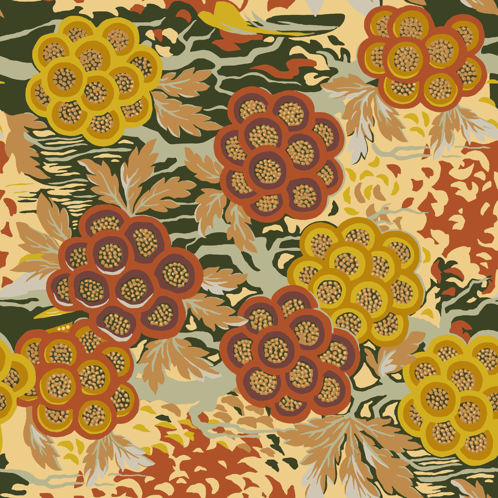 Retro folk floral pattern featuring oversized stylized berries in warm autumn colors of mustard yellow, orange, and brown on a vintage cream background.