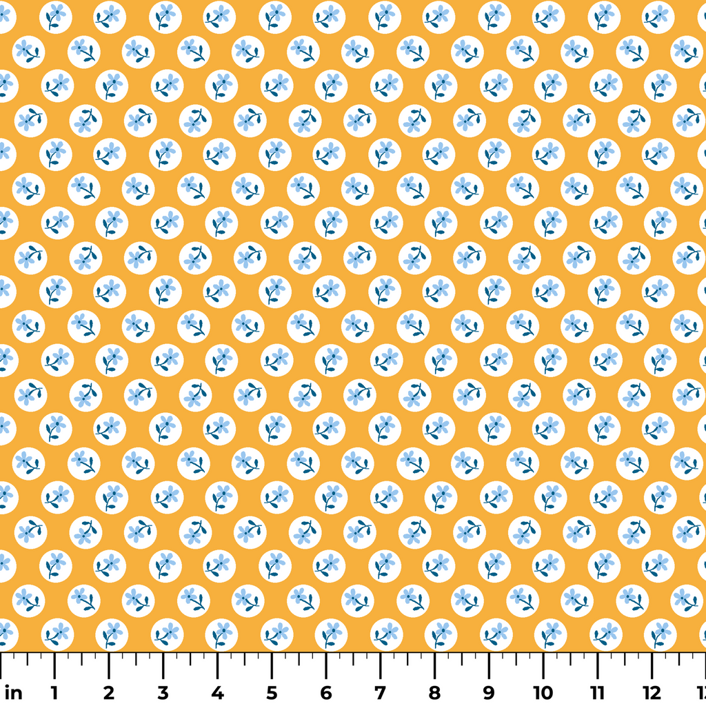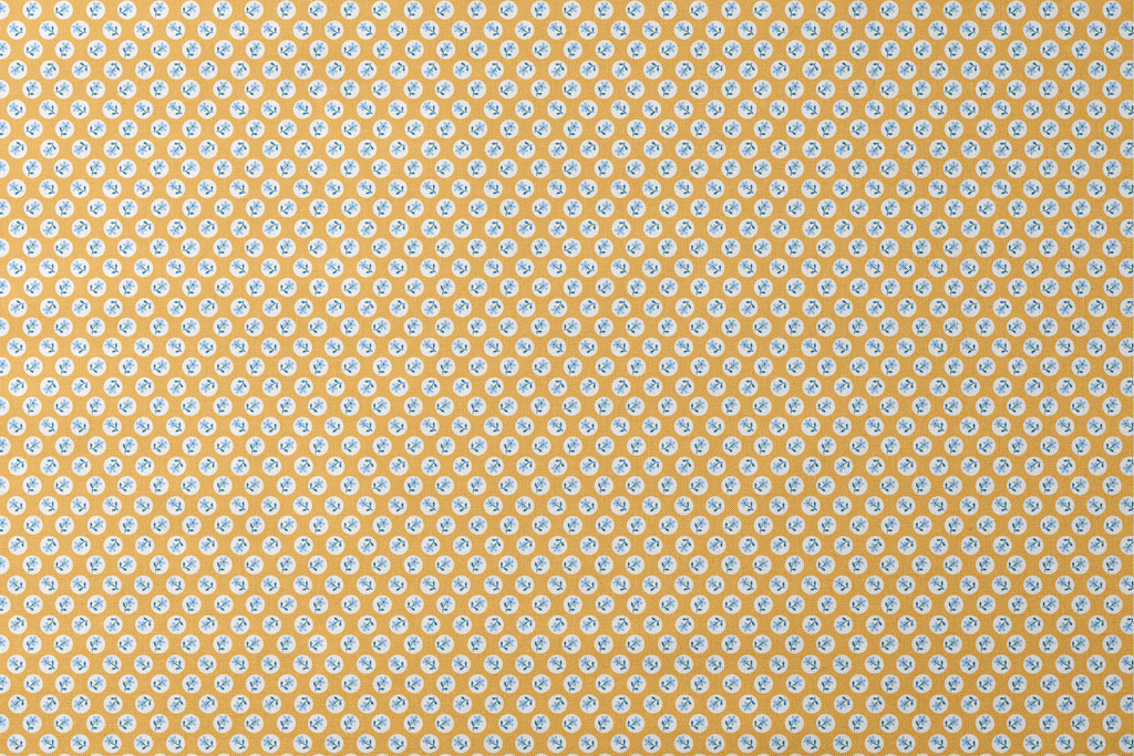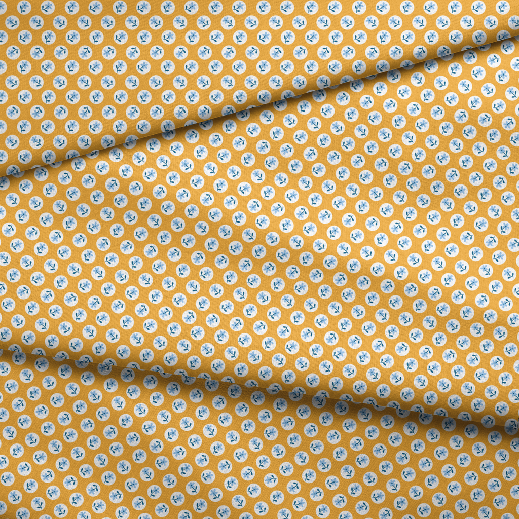 Delicate blue floral pattern on a warm mustard background, featuring small hand-painted blossoms in white circular frames. Perfect for contemporary home decor with a touch of vintage charm.