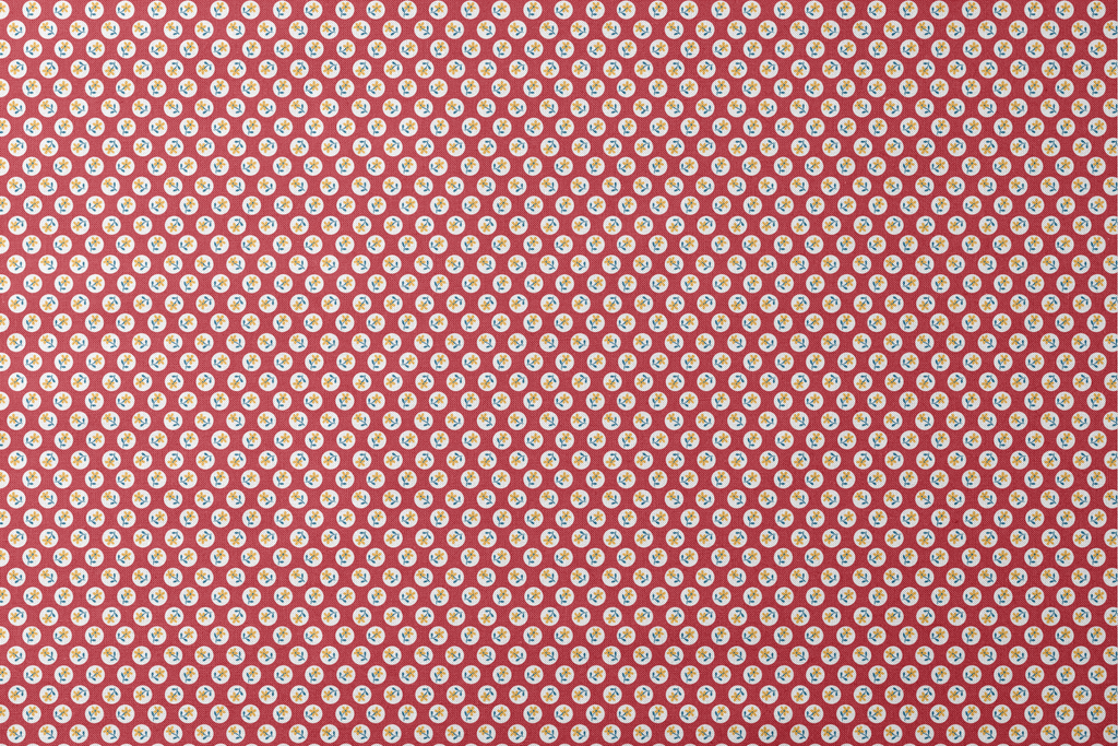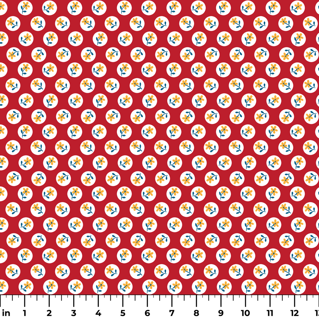 Vintage floral medallions in cheerful yellow and teal on a rich red background, perfect for home decor or quilting projects with a retro, heritage-inspired charm.