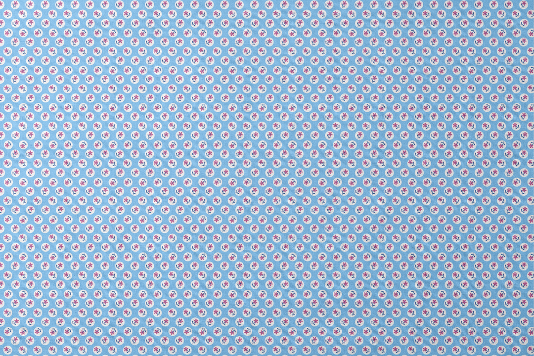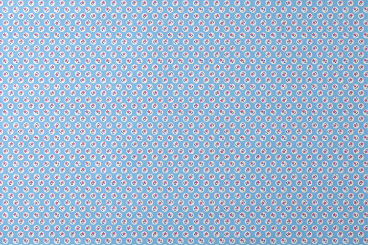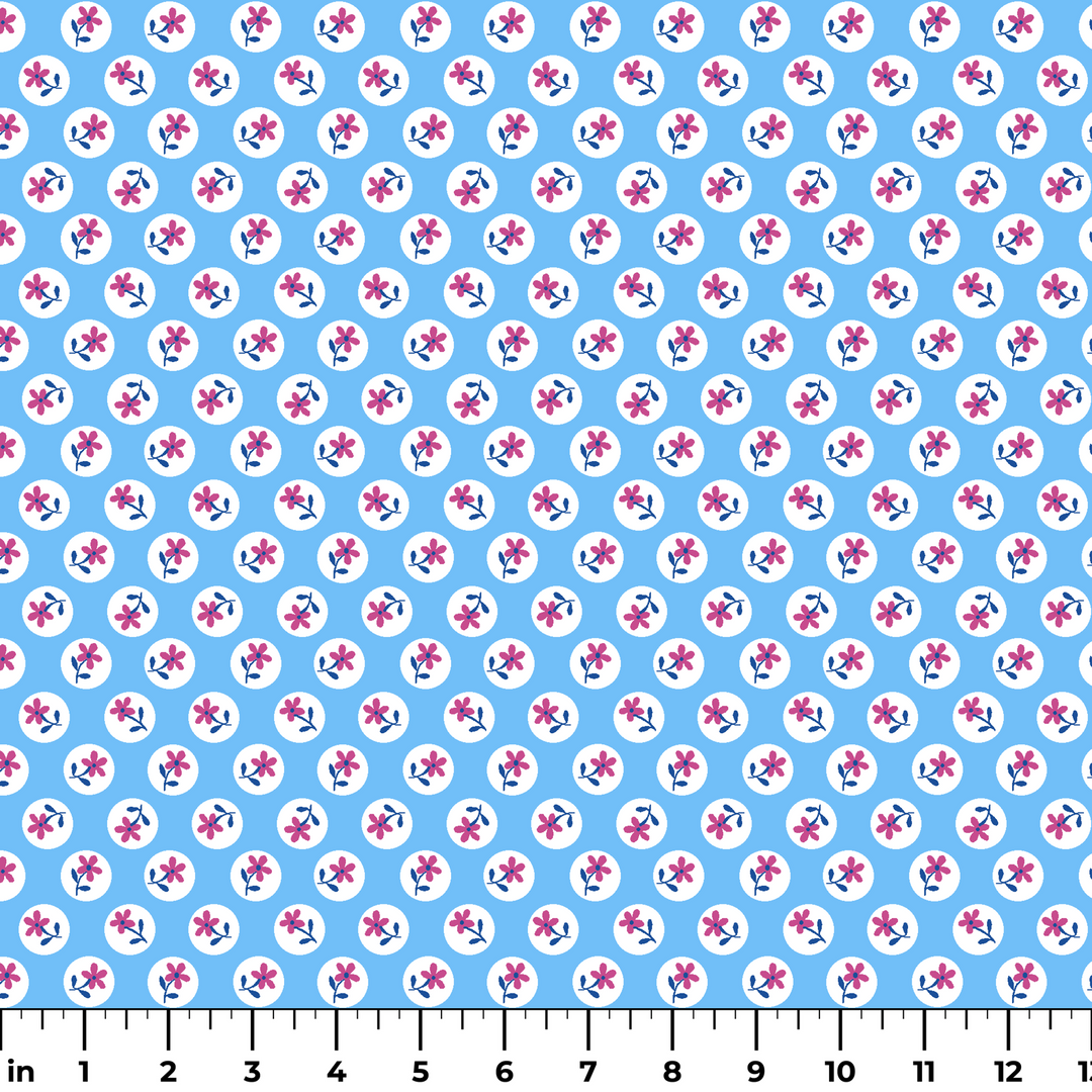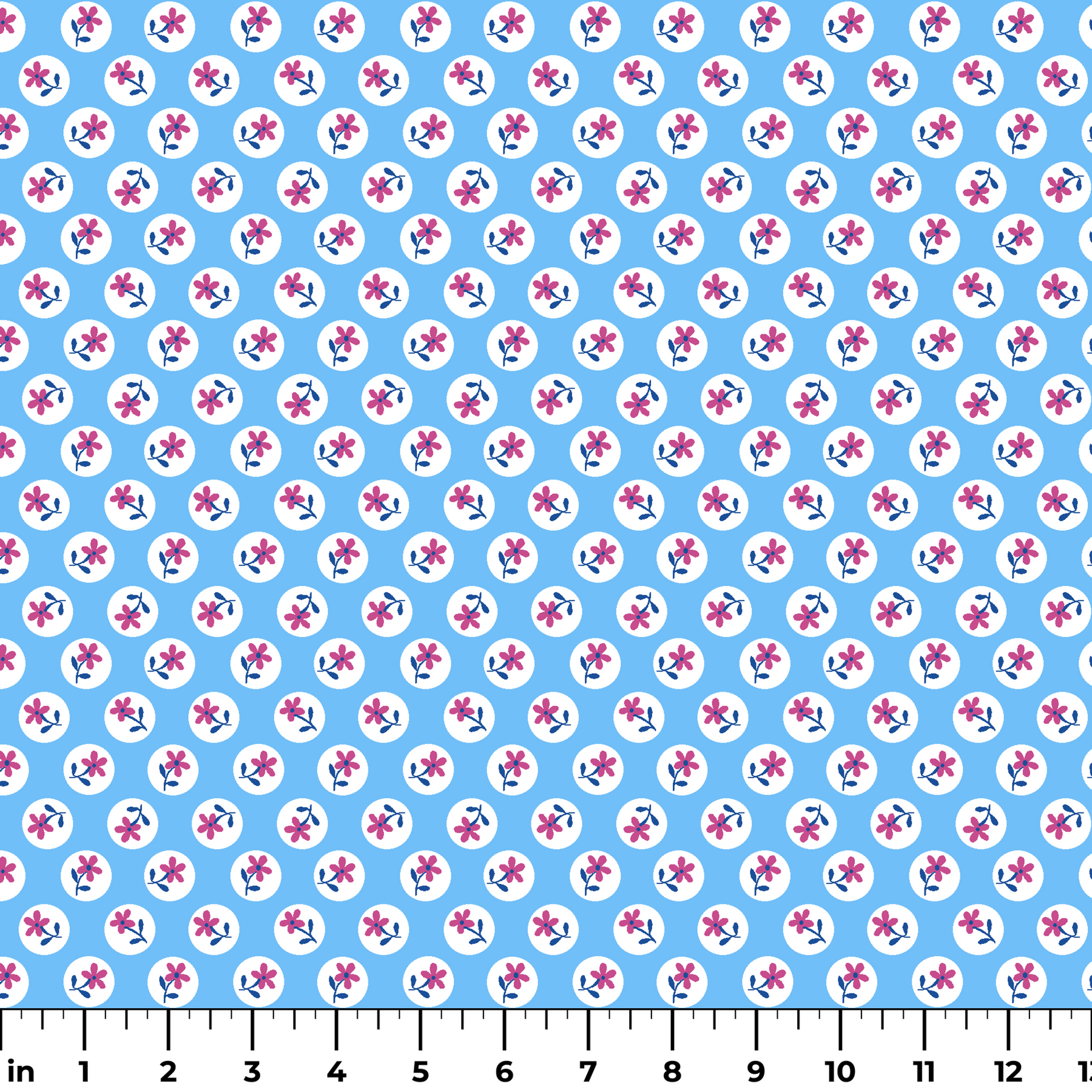 Delicate purple flowers with blue stems pattern a light blue background in polka dot-like circles, creating a whimsical floral design perfect for spring apparel or home decor.
