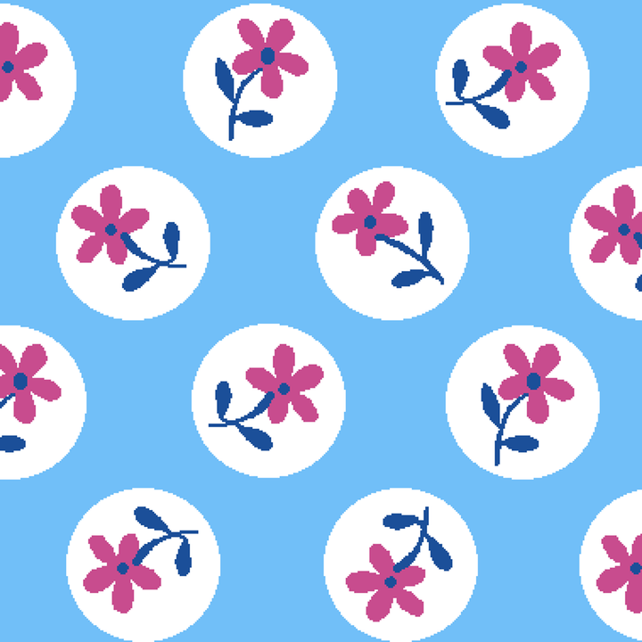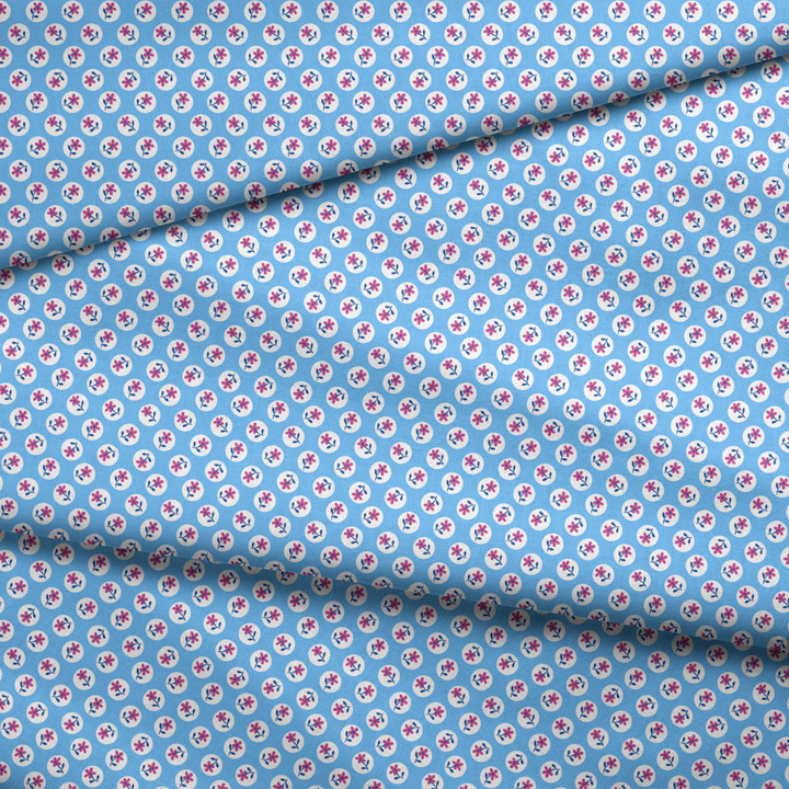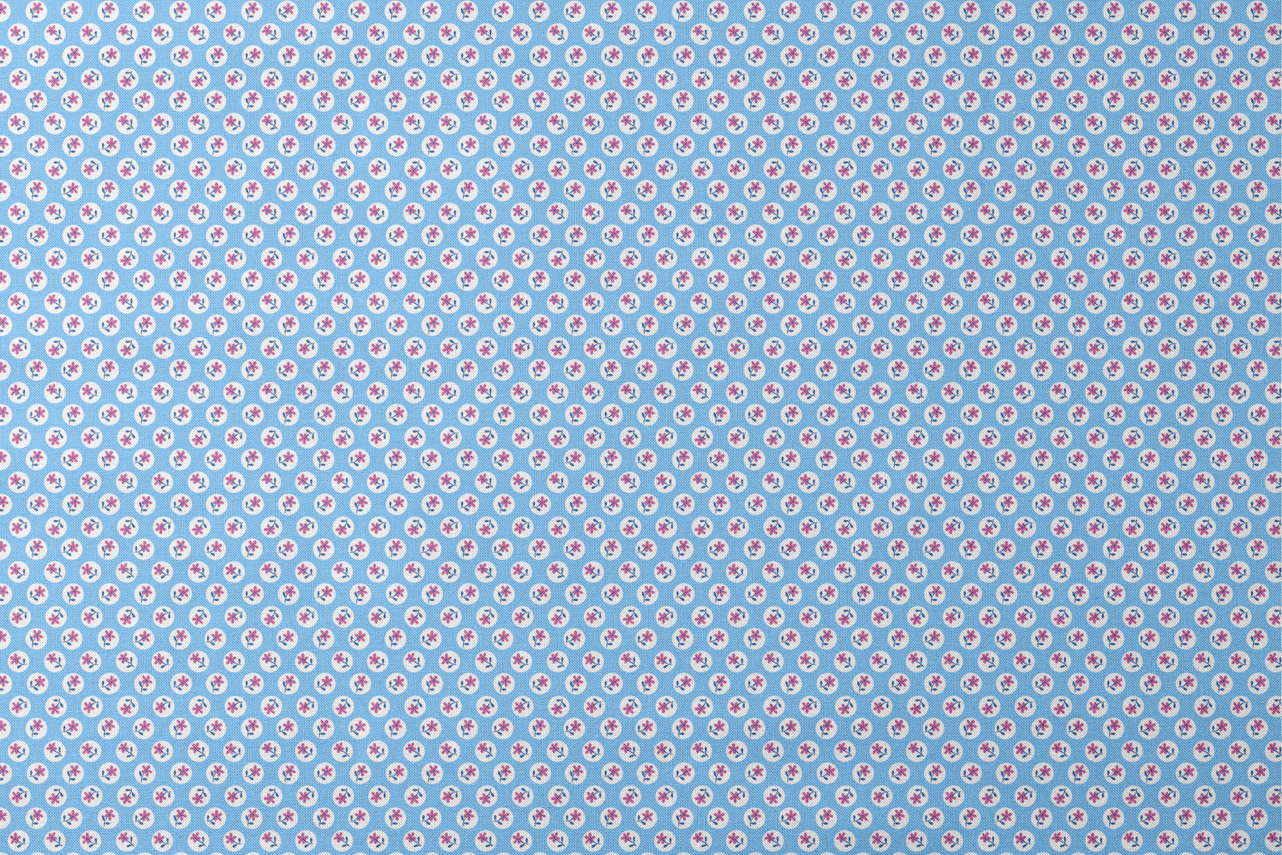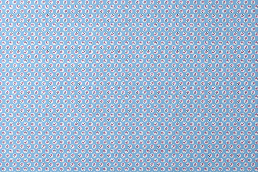 Delicate purple flowers with blue stems pattern a light blue background in polka dot-like circles, creating a whimsical floral design perfect for spring apparel or home decor.