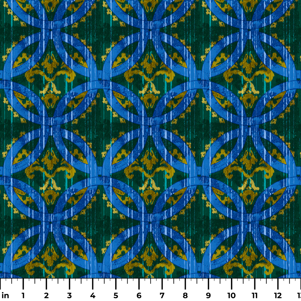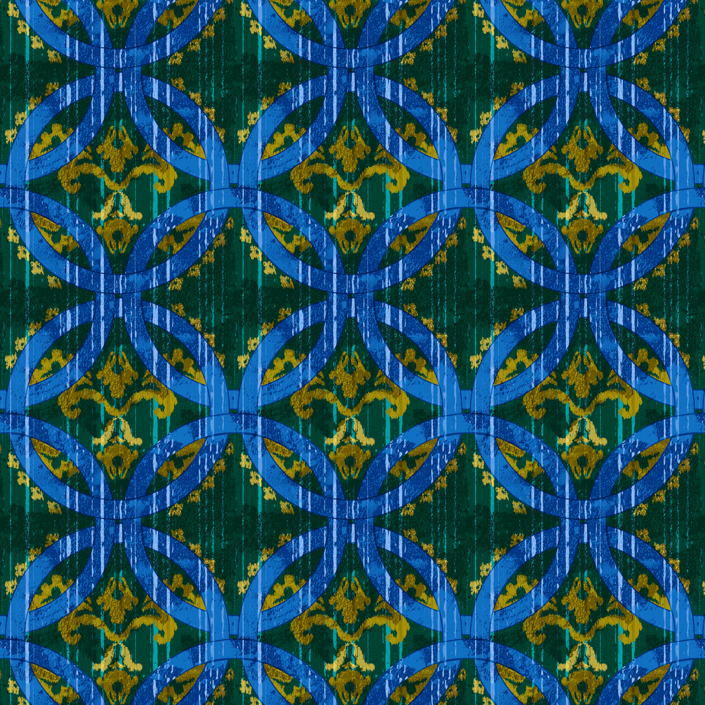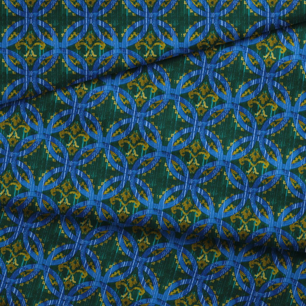 Vibrant geometric pattern with interlocking blue circle motifs on a rich green background, creating a dynamic contemporary design with a touch of tribal influence.