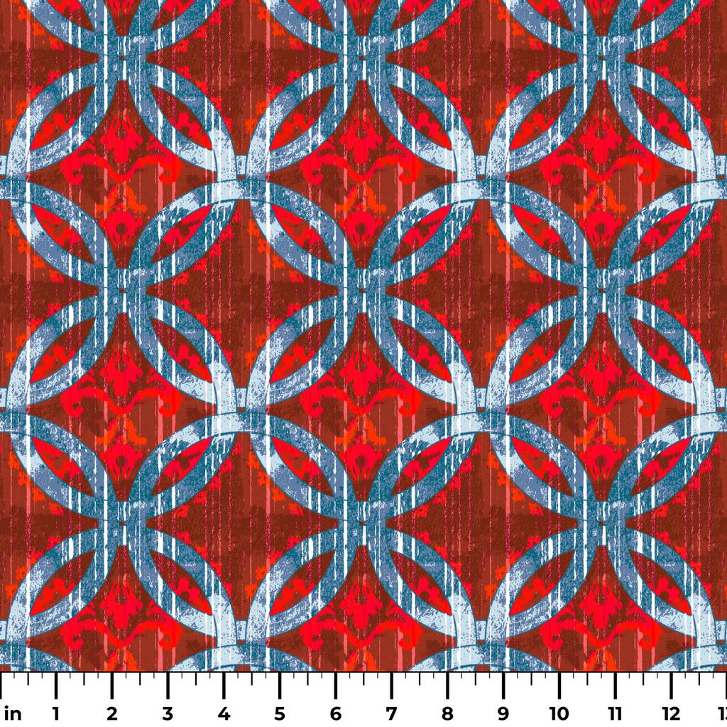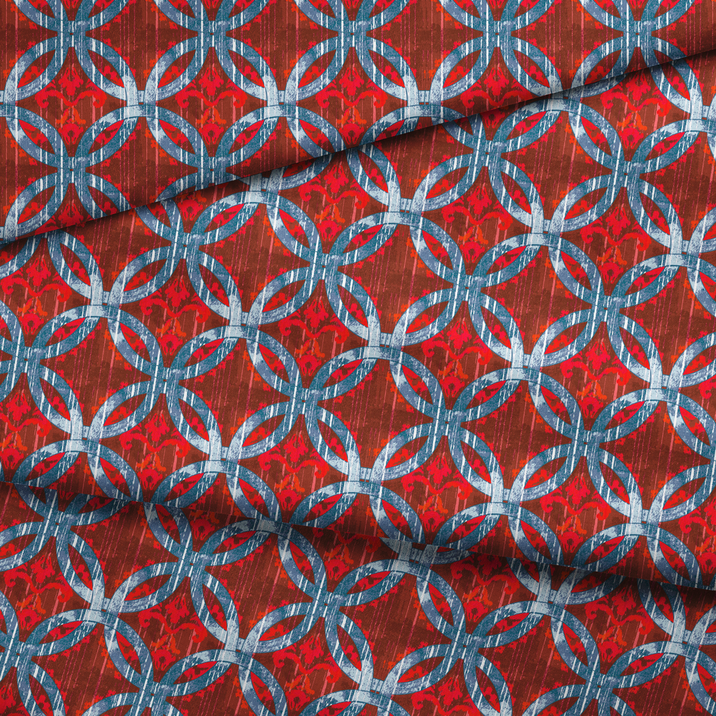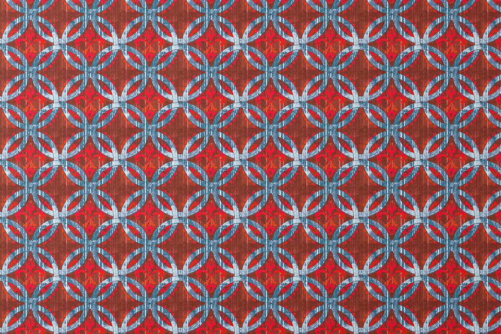 Bold geometric pattern featuring interlocking circles in vibrant red and blue on a textured rustic background. Perfect for contemporary home decor with a mid-century modern aesthetic.