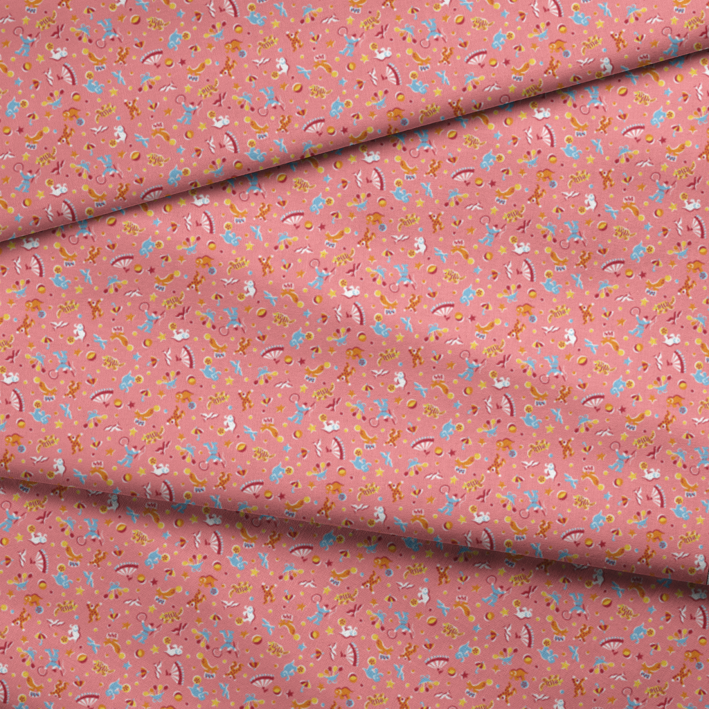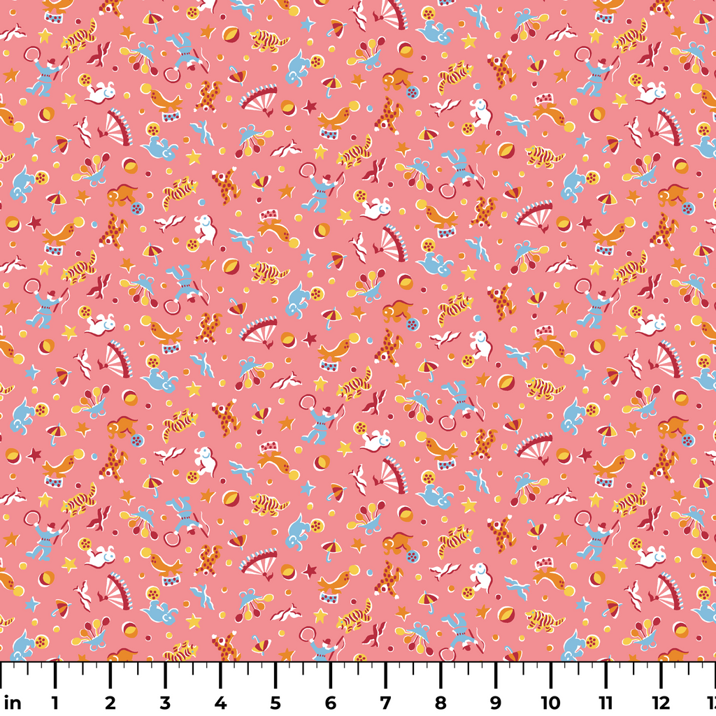 A whimsical circus-themed pattern dances across a coral background, featuring playful elephants and tigers in cheerful blue, white, yellow, and orange hues. Decorative elements like beach balls, umbrellas, tents, and twinkling stars are scattered throughout, creating a delightful sense of carnival movement. This festive fabric would be perfect for children's room accessories or a fun-loving quilting project that celebrates the magic of the big top.
