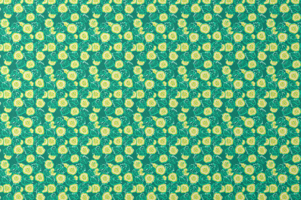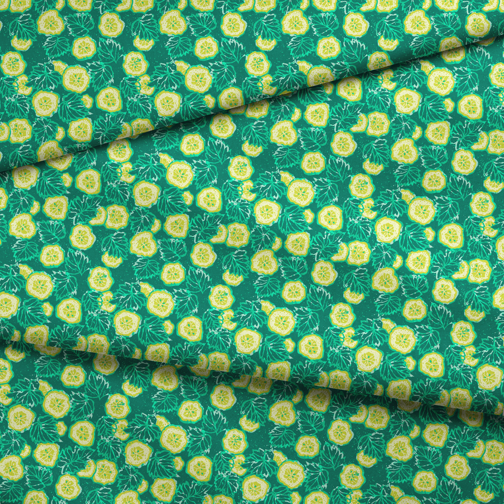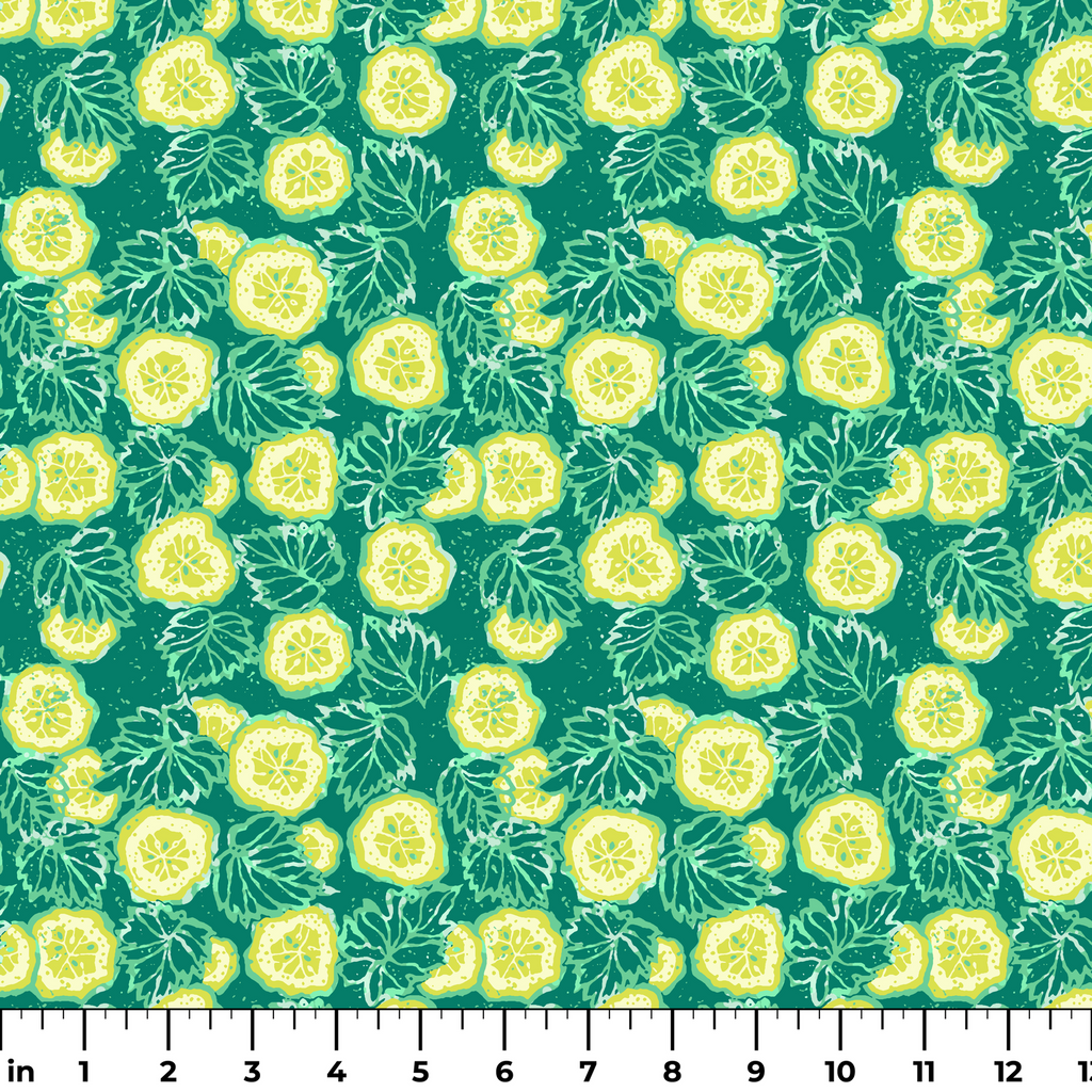 Vibrant cucumber slices and leafy elements create a fresh, summery pattern on a rich teal background. Perfect for a kitchen-inspired look with a modern botanical twist.