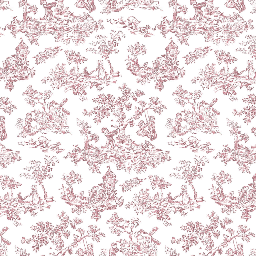 French country toile in rich red and white featuring delicate floral motifs and pastoral scenes in an antique traditional style. Perfect for heritage revival spaces.