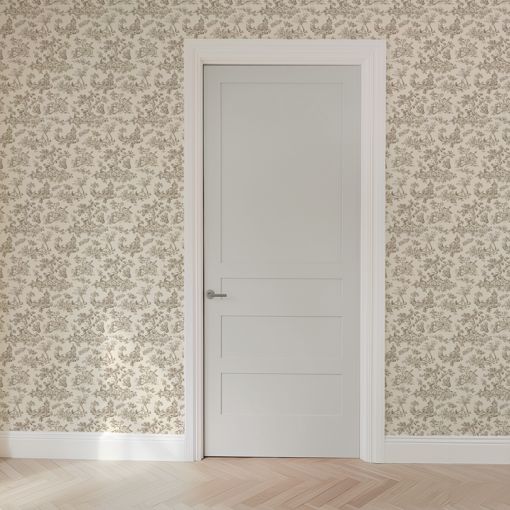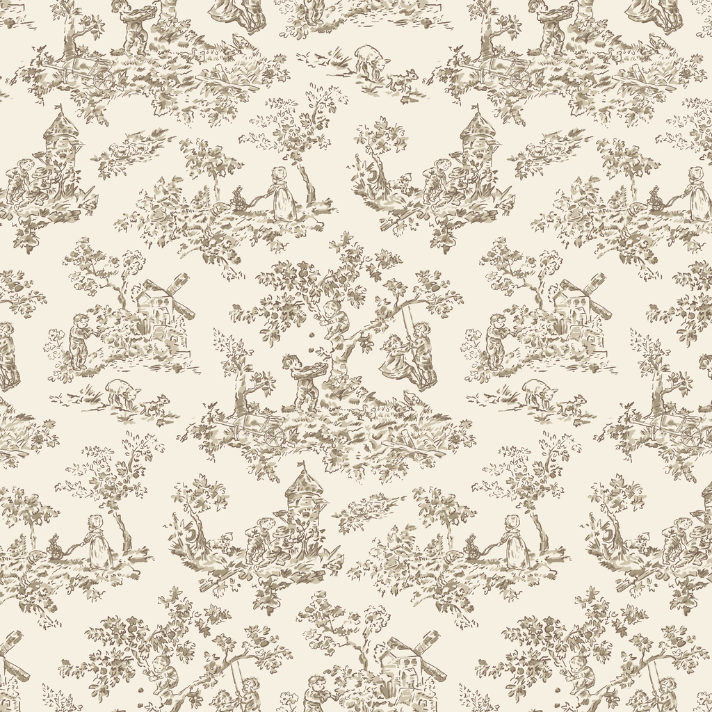 French country toile in warm neutral brown on tan featuring delicate floral motifs and pastoral scenes in an antique traditional style. Perfect for heritage revival spaces.