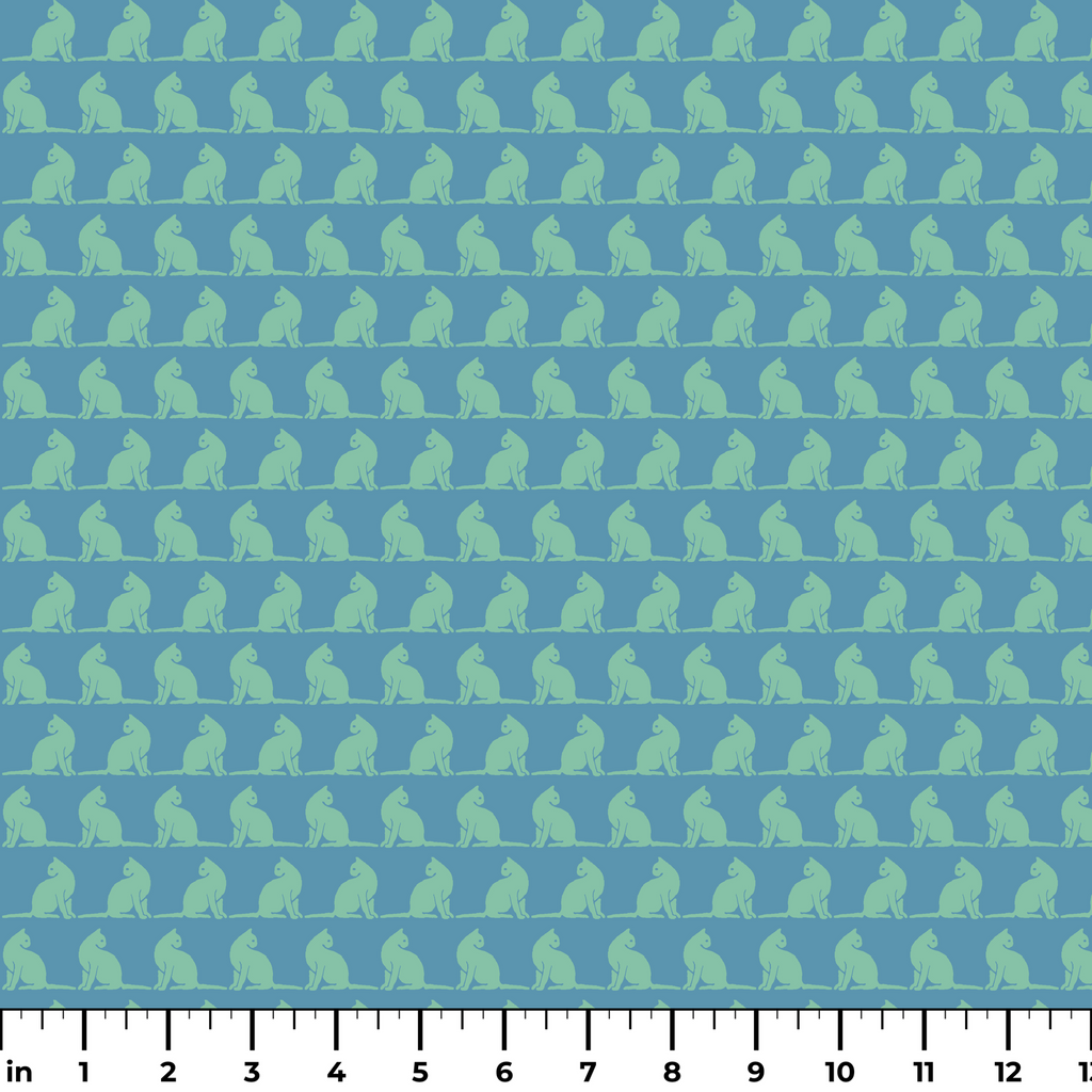 Retro green cats on a blue background with vintage mid-century modern style and a repeating animal motif design.