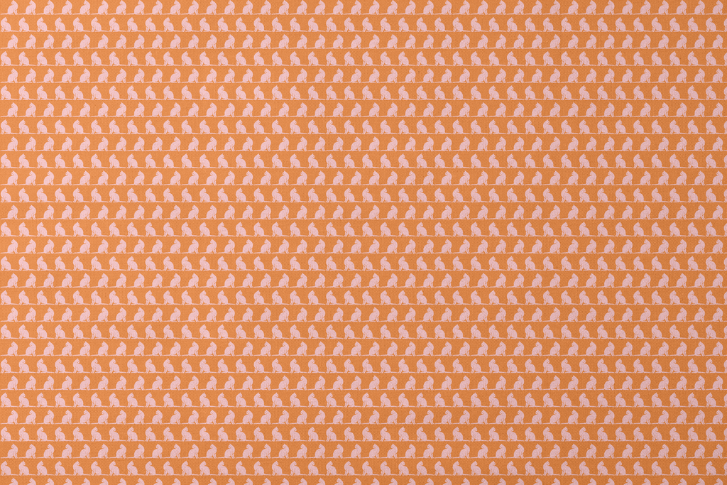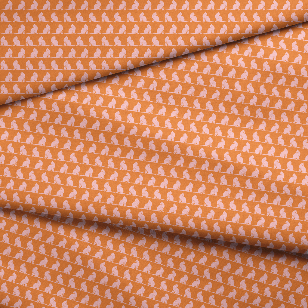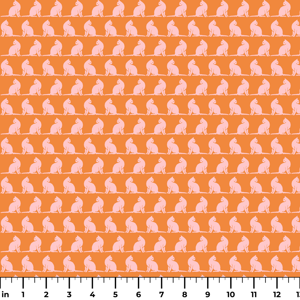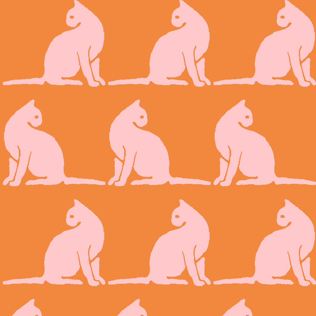 Retro pink cats on a vibrant orange background in a playful repeating pattern perfect for contemporary home decor and apparel.