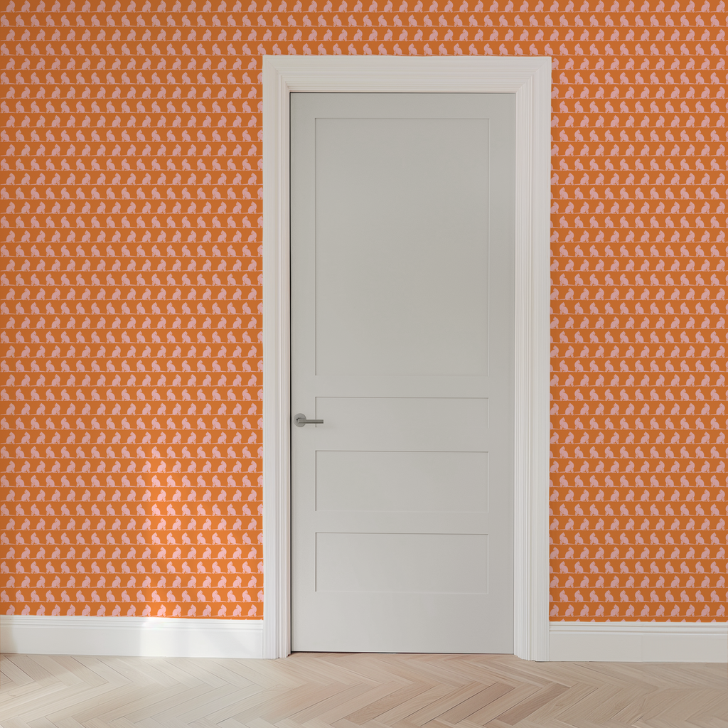 Adorable pink cats on a bright orange background in a charming repeating pattern perfect for cat lovers.