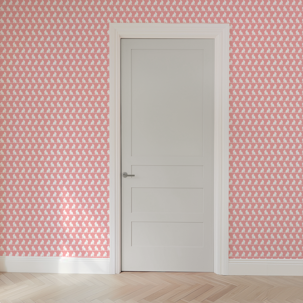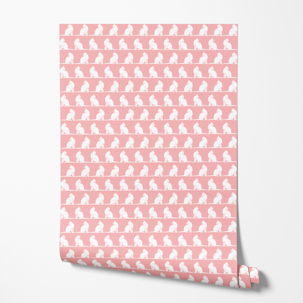 Pink and white cat silhouette pattern featuring sitting felines in repeating rows on a soft pink background, perfect for cat lovers.