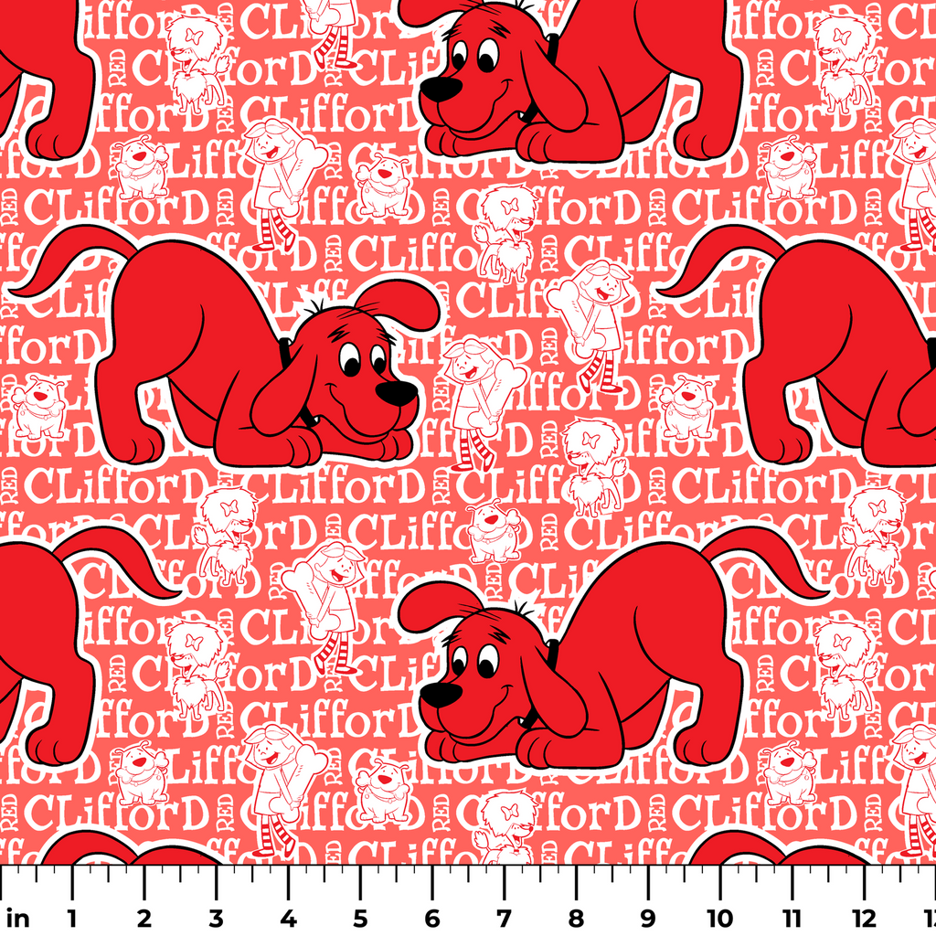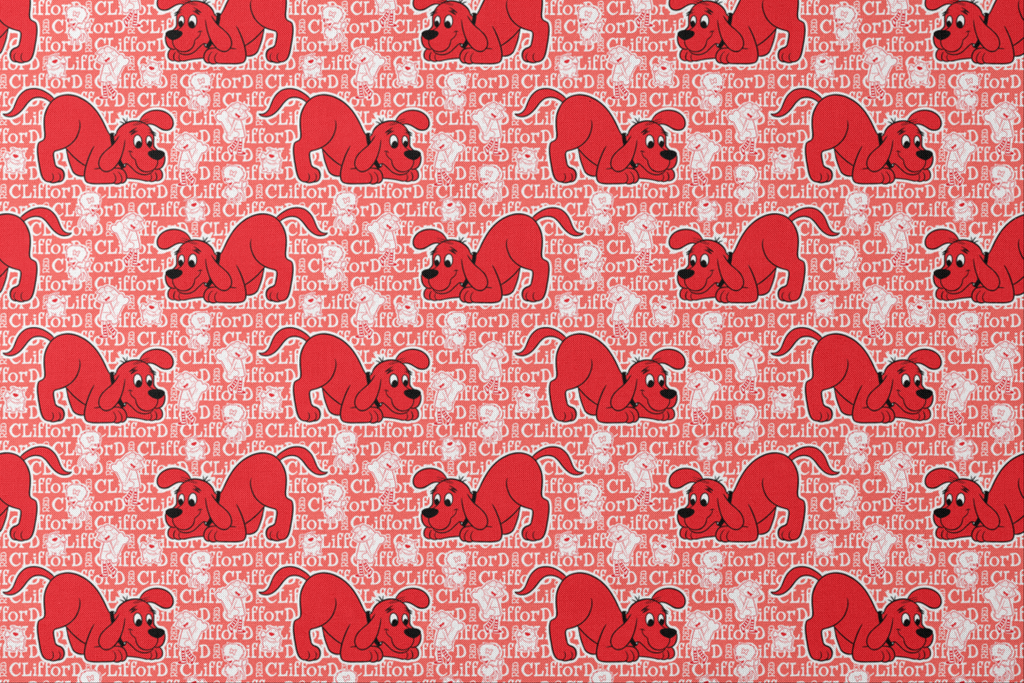 Vibrant blush background featuring the beloved Clifford the Big Red Dog character playfully posing amid repeating "Clifford" text with Cleo and other favorite friends. Perfect for fans of the classic children's book series.