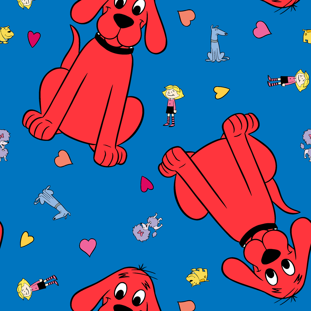 Adorable Clifford the Big Red Dog on a vibrant blue background showcases playful Clifford, Cleo, T-Bone and friends character illustrations and colorful heart motifs. Perfect for kids room decor.