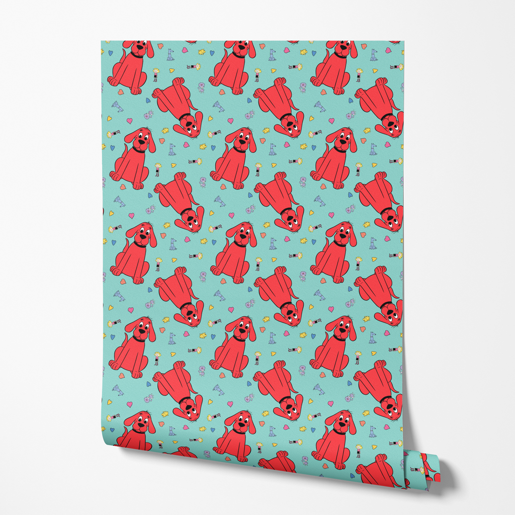 Adorable Clifford the Big Red Dog on a mint green background showcases playful Clifford, Cleo, T-Bone and friends character illustrations and colorful heart motifs. Perfect for kids' rooms.