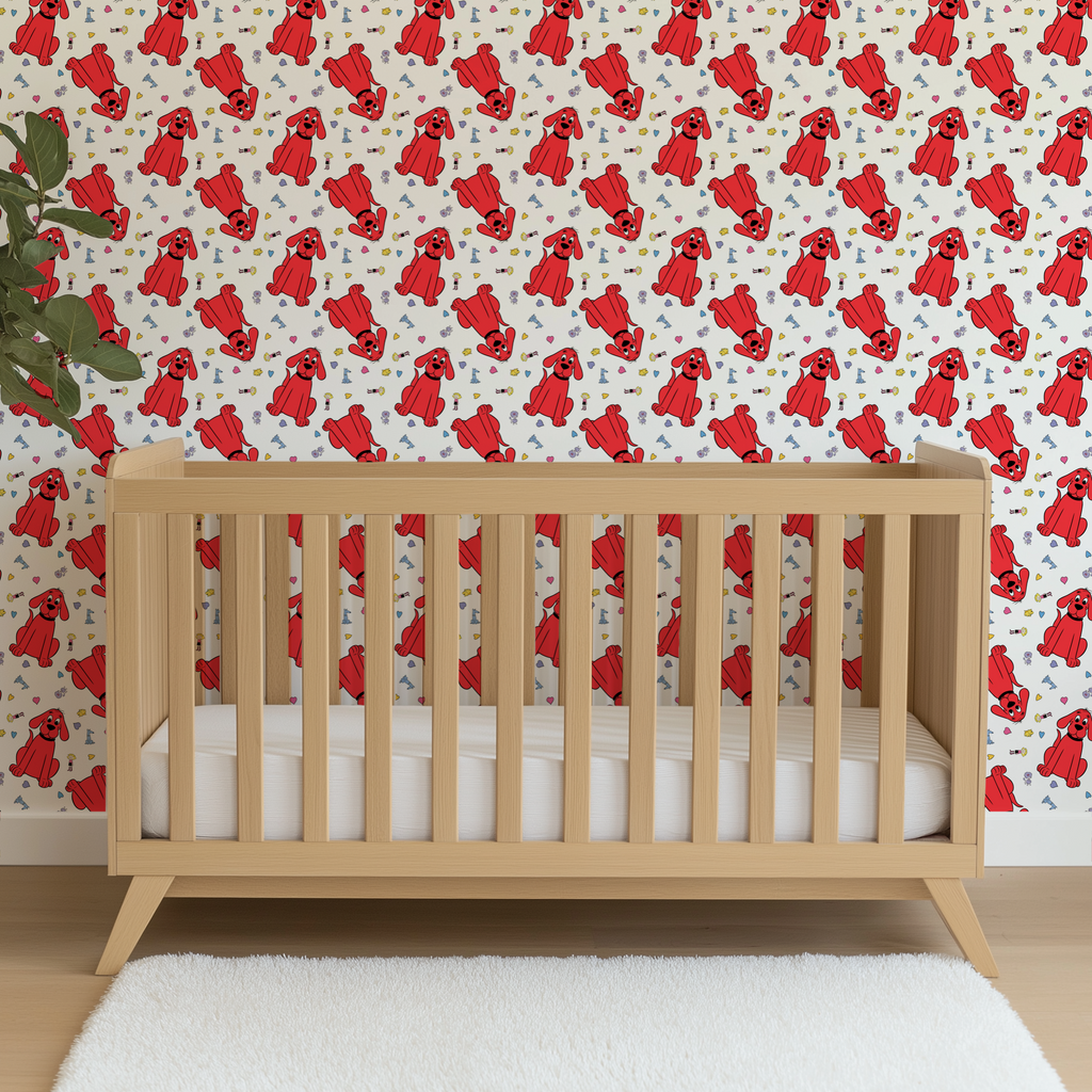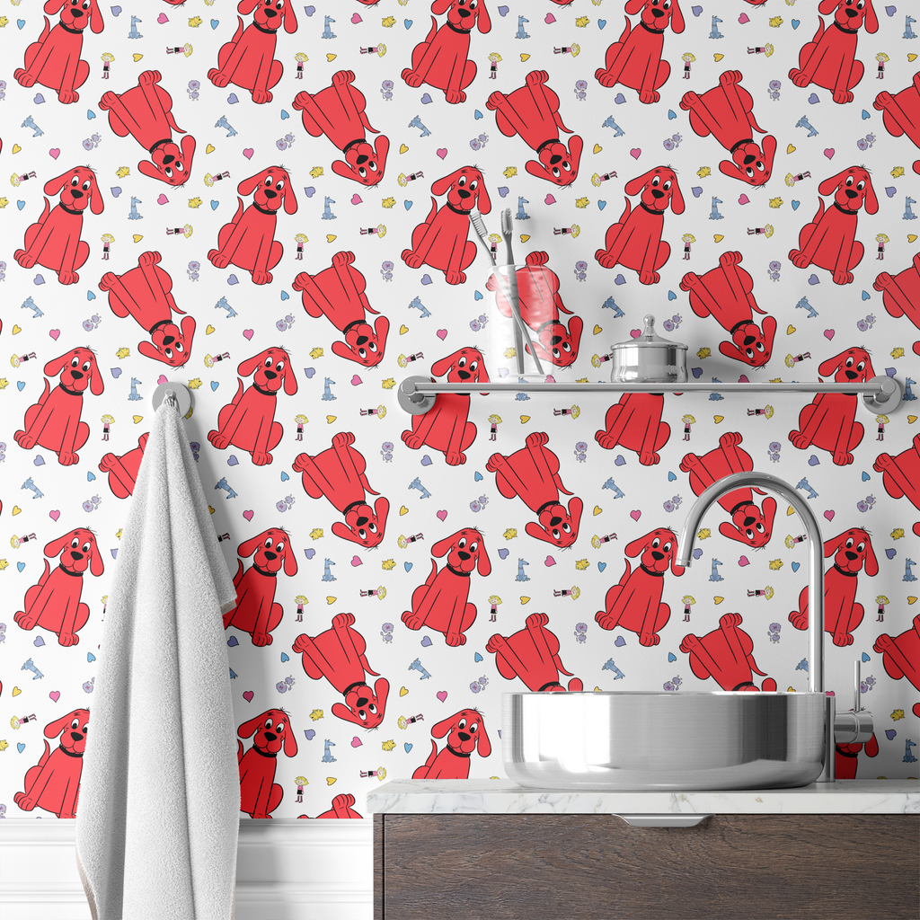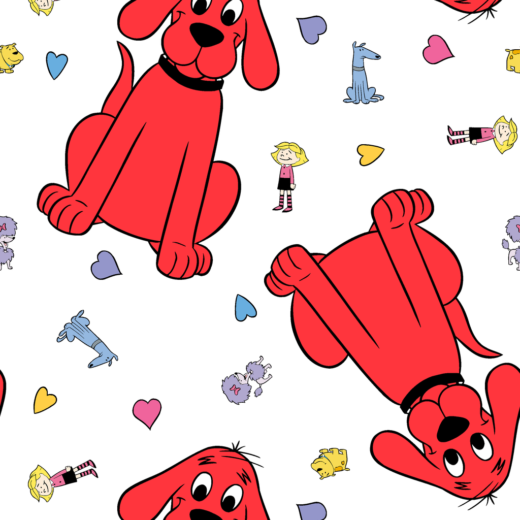 Adorable Clifford the Big Red Dog on a white background showcases playful Clifford, Cleo, T-Bone and friends character illustrations and colorful heart motifs. Perfect for kids' rooms.